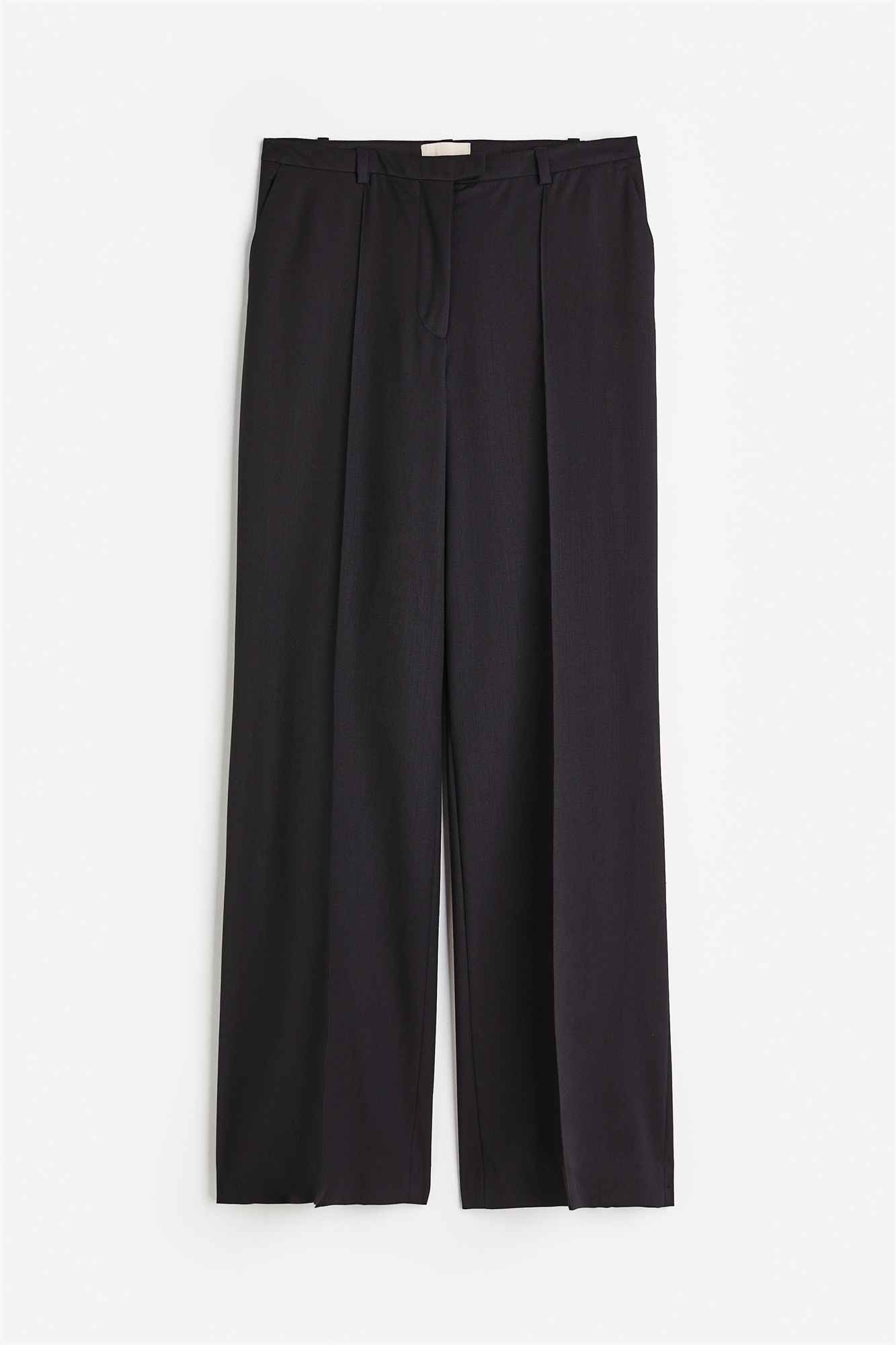 Приталенные брюки из мягкой шерсти с высокой талией, ширинкой на молнии и узким удлиненным поясом с потайной застежкой на пуговицу и крючок с ушком. Диагональные боковые карманы, накладной задний карман и широкие прямые ноги со складками.