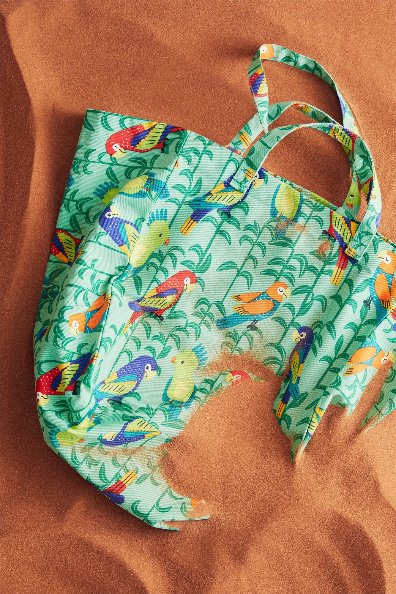 Просторная пляжная сумка из прочной хлопковой саржи с принтом на всю ширину. Две пары ручек сверху и завязки по длинным сторонам, которые можно застегнуть через верх. Одно внутреннее отделение. Без подкладки. Глубина 30 см. Ширина 40 см. Высота 42 см.