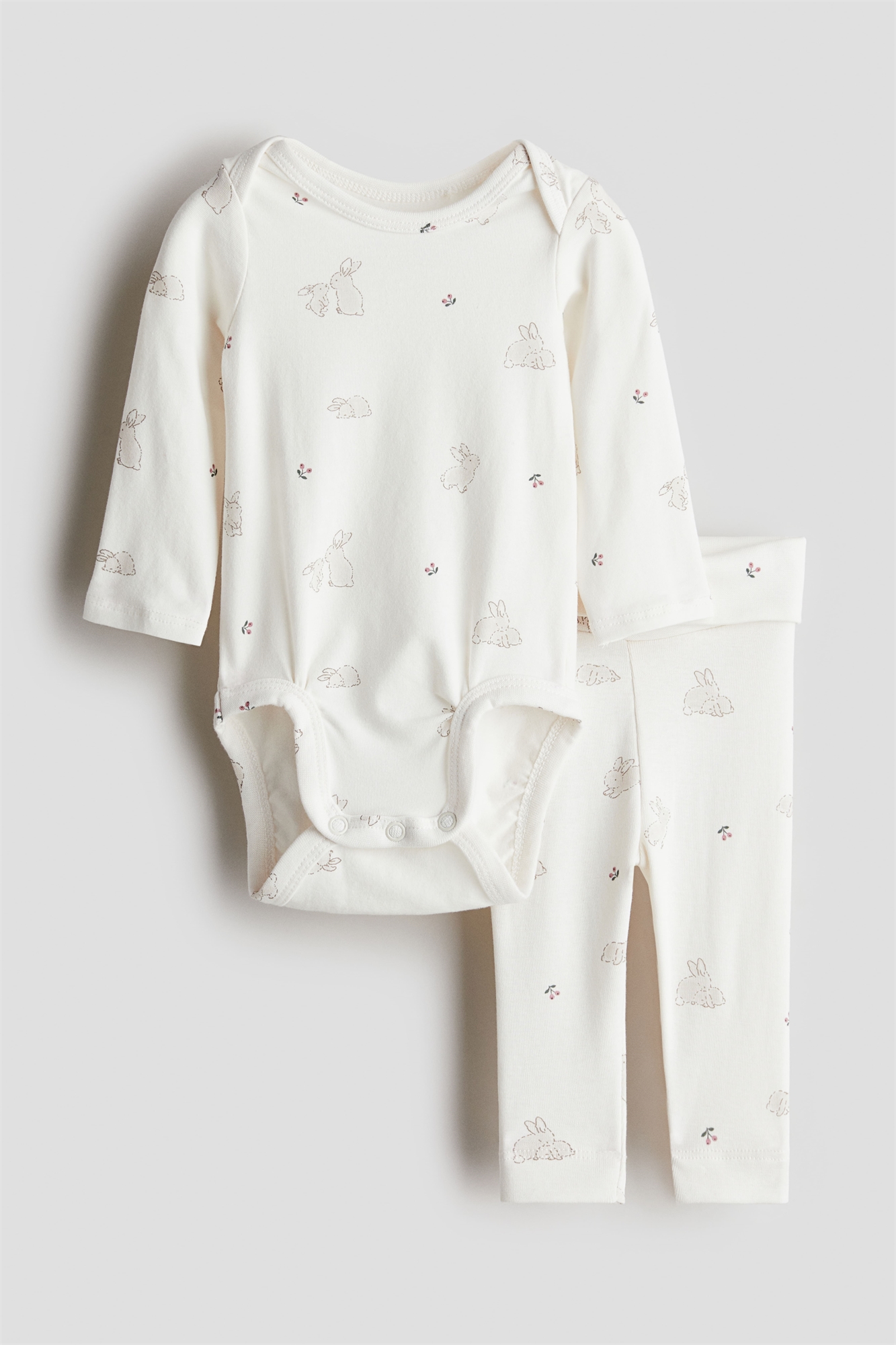 Комплект из комбинезона и леггинсов из супермягкого хлопкового джерси. Боди с длинными рукавами, спущенными плечами, кнопками в промежности и сборчатыми швами вокруг ножек для более удобного и плотного прилегания к подгузнику. Леггинсы с ребристой складкой на талии для удобной посадки на животике.