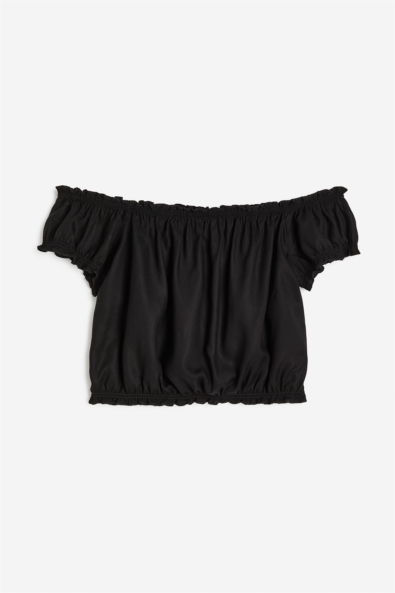 Короткая блузка Loose Fit с открытыми плечами из воздушного вискозного полотна с короткими рукавами. Узкая резинка и небольшая оборка в верхней части, на рукавах и подоле.