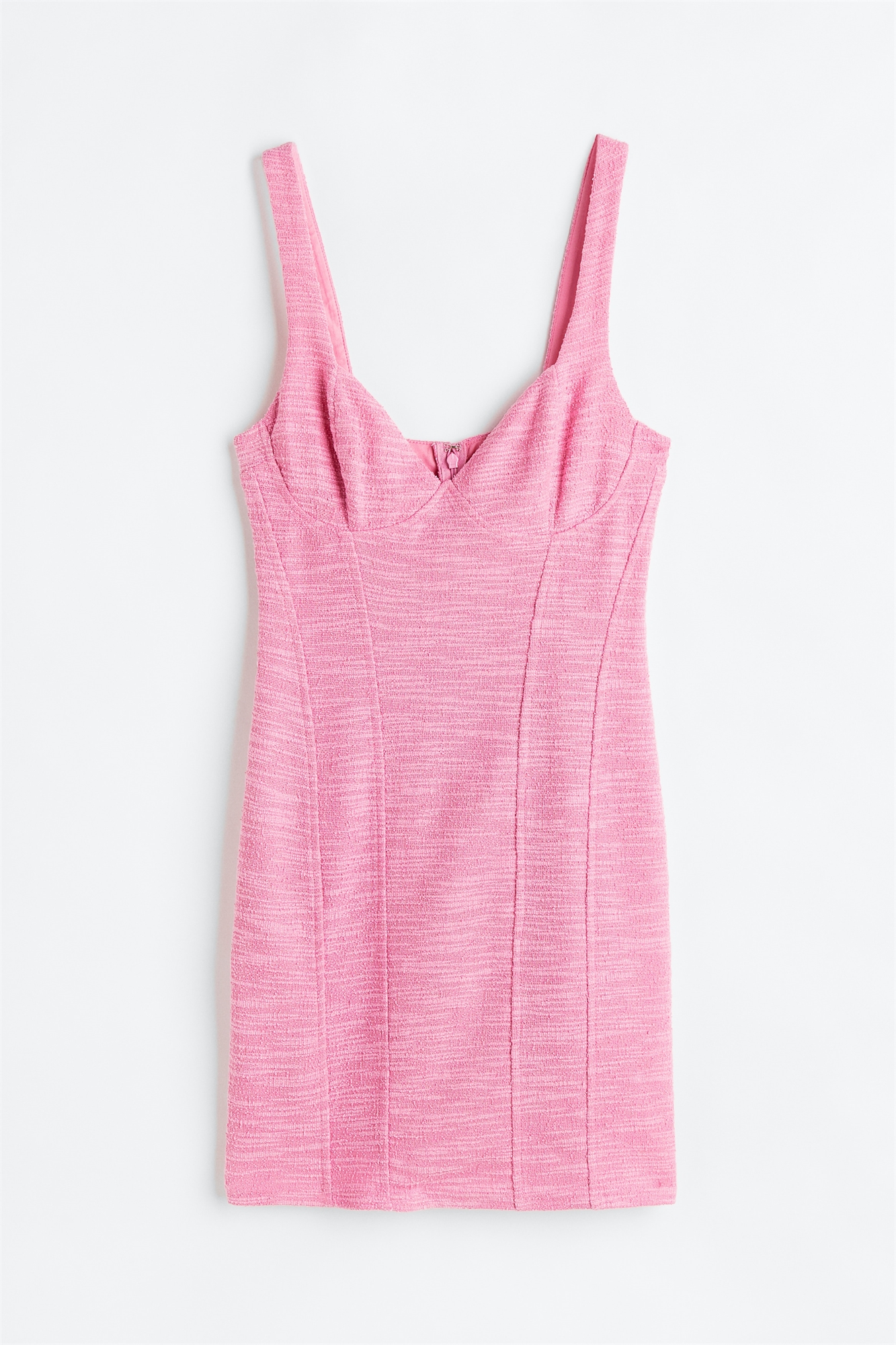 Короткое приталенное платье из фактурного полотна с вырезом в форме сердца, формованными чашечками и формирующими швами спереди и сзади. Скрытая молния и застежка-крючок сзади, а также прямой подол. Без подкладки.