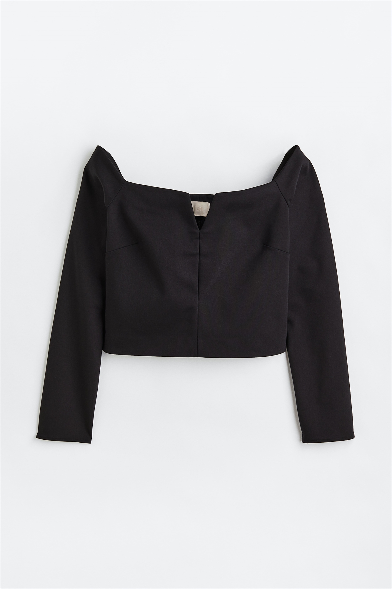 Короткая, облегающая фигуру блузка на плечах из хлопкового микса. Модель с небольшим V-образным вырезом спереди, длинными рукавами, потайной застежкой на молнию и крючок сзади и прямым подолом. Без подкладки.