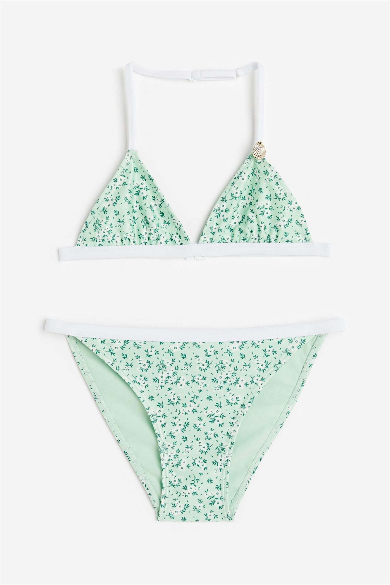 Полностью закрытое бикини с верхней частью с вырезом под халтернек и соответствующими нижними частями. Топ с узкой регулируемой бретелью на шее и эластичной лентой с пластиковой застежкой сзади. Низ с резинкой на талии.