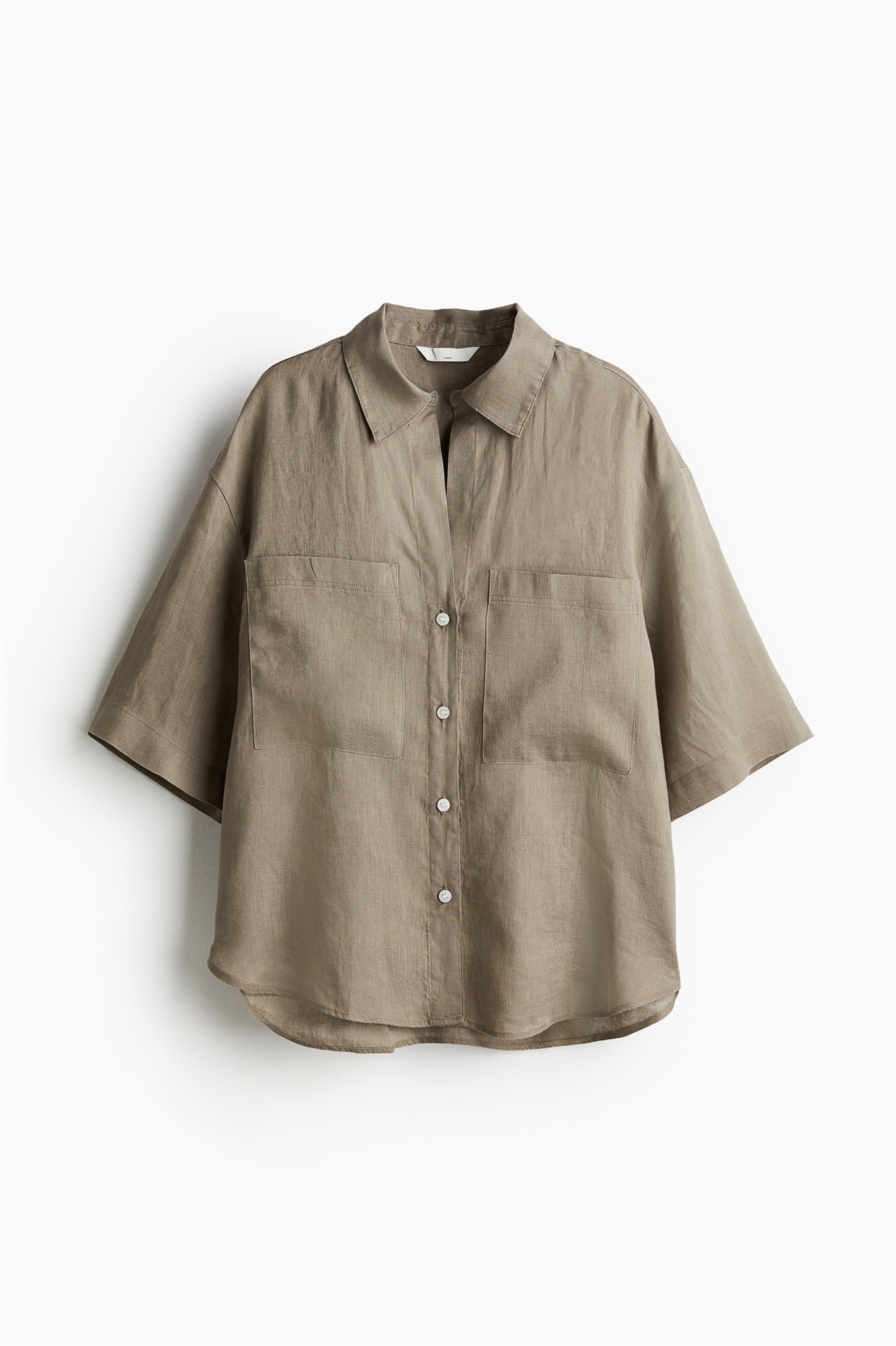 Свободная рубашка из воздушного льна с воротником, пуговицами спереди и большими нагрудными карманами. Двухслойный воротник сзади, слегка спущенные плечи и короткие рукава. Закругленный подол.