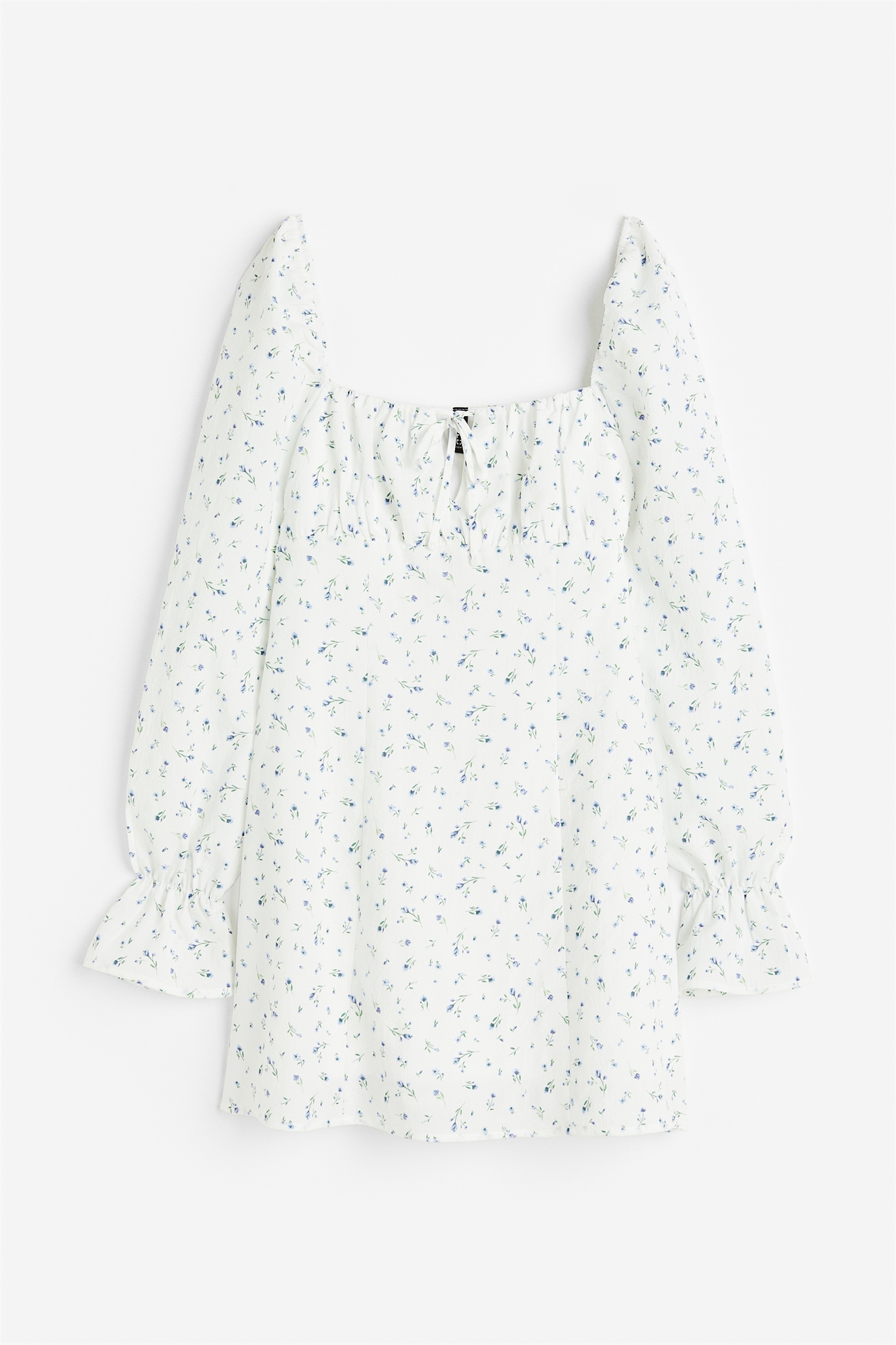 Короткое платье А-линии из крепа с приталенным лифом, собранными фигурными чашечками и небольшой проймой с узкими завязками спереди. Квадратный вырез с узкой эластичной резинкой спереди и сзади и длинные пышные рукава с узкой эластичной резинкой и воланом на манжетах. На подкладке в области бюста.