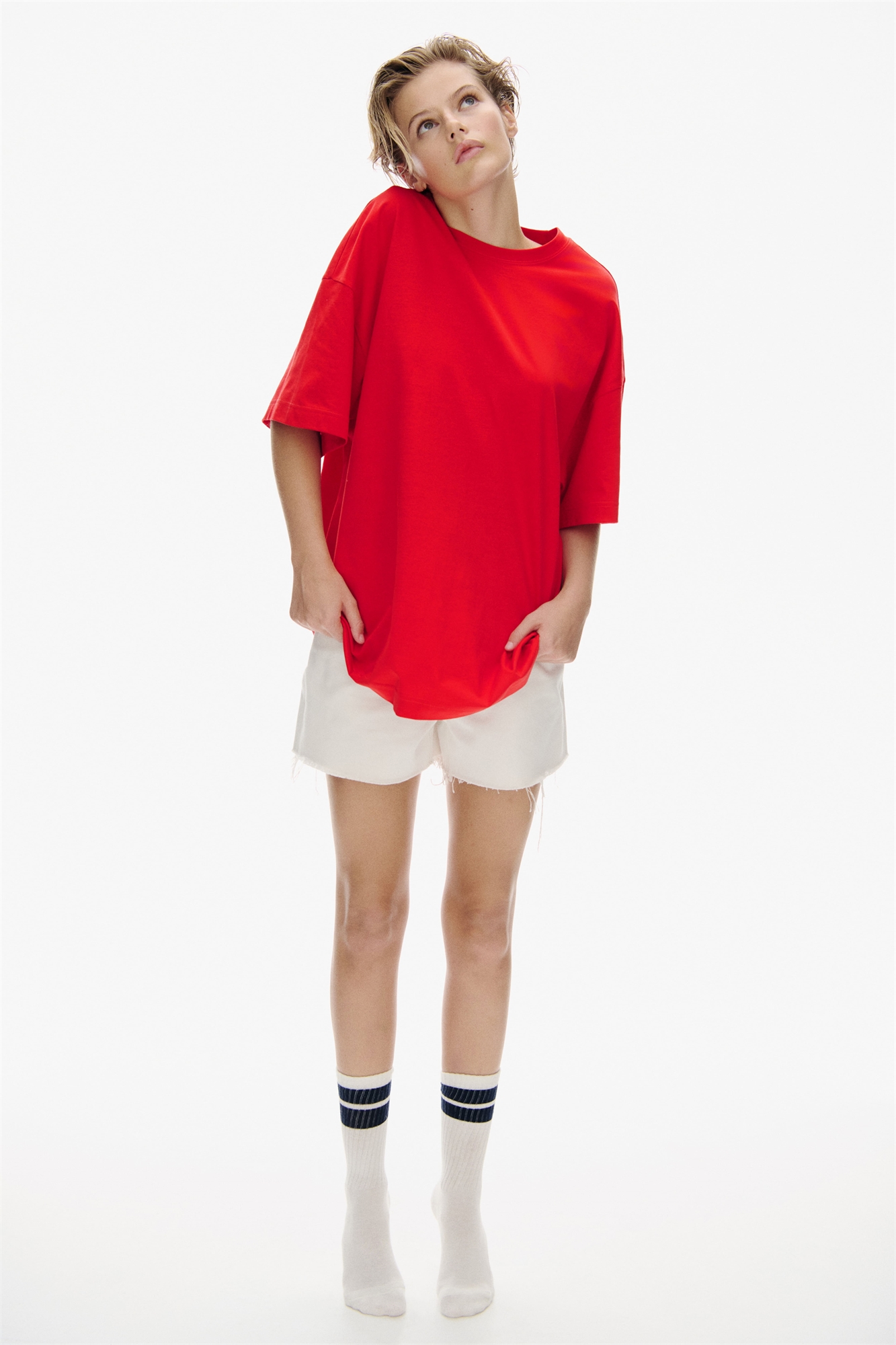 Футболка оверсайз из мягкого хлопкового джерси с ребристой отделкой горловины и низко опущенными плечами.
