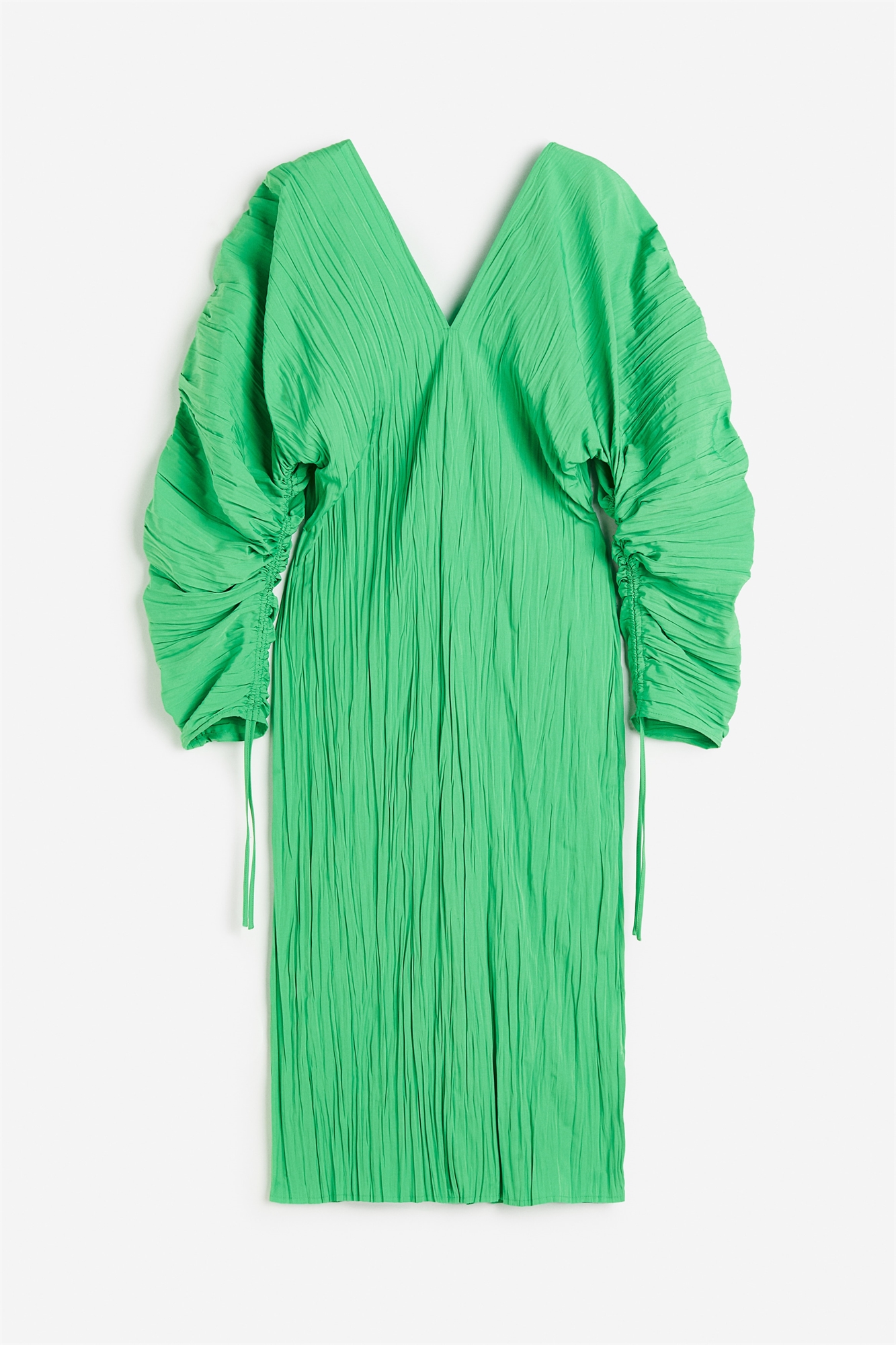 Платье длиной до колена с V-образным вырезом спереди и сзади. Длинные объемные рукава-баллоны с узкими завязками на манжетах. Шлица сзади. Без подкладки.