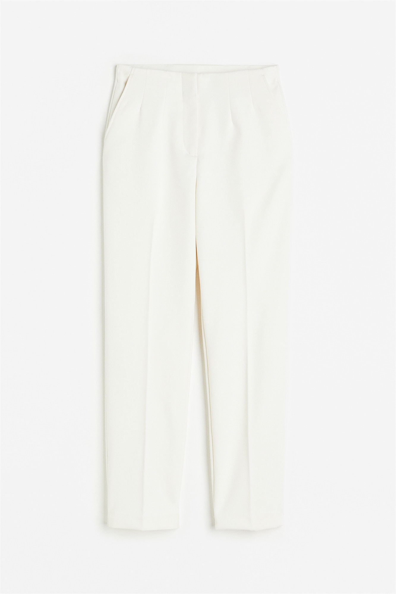 Саржевые брюки длиной до щиколоток с высоким поясом. Ширинка на молнии с потайной застежкой на пуговицу и крючок. Вытачки на поясе спереди и сзади, косые карманы спереди и прорезные карманы сзади. Зауженные ноги со складками спереди и сзади.
