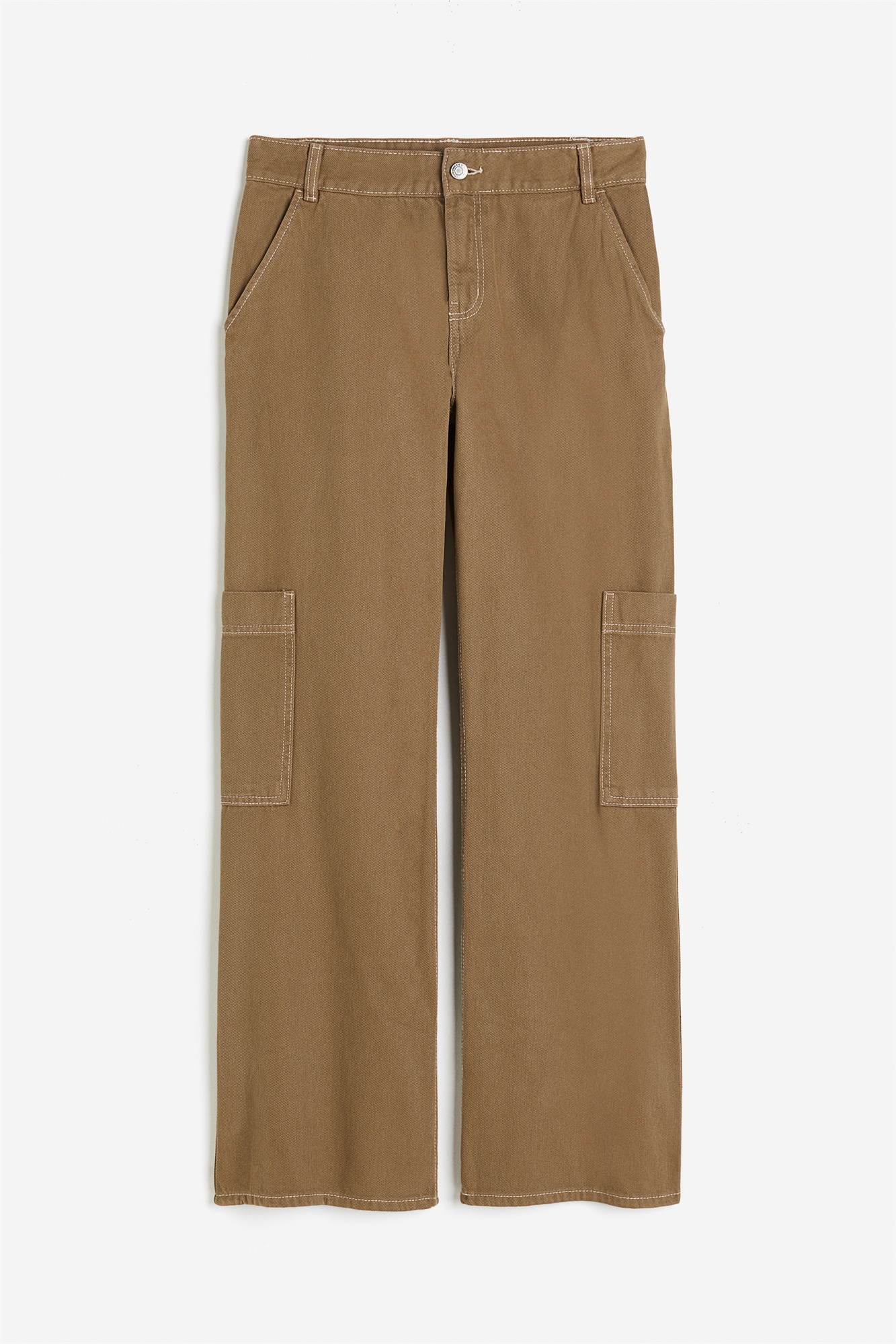 Брюки из хлопковой саржи с обычной талией, ширинкой на молнии и пуговице, диагональными боковыми карманами, накладными карманами на ногах и открытыми задними карманами. Широкие штанины с петлей для молотка на одной штанине.