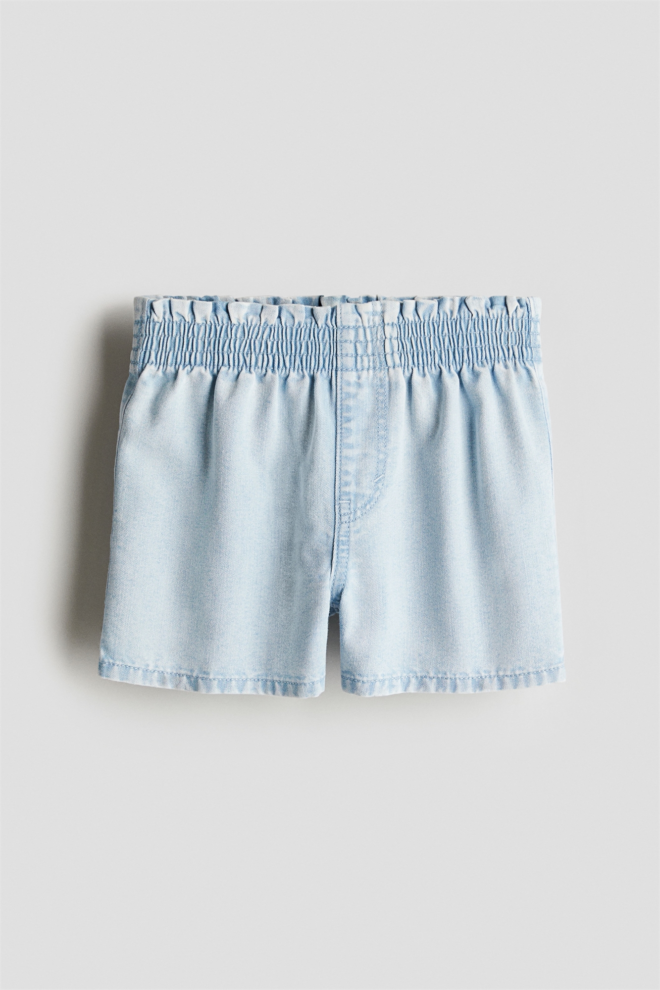 Шорты свободного покроя из моющегося легкого денима. Легкая утяжка на талии, эластичная вставка и фальшивая ширинка.