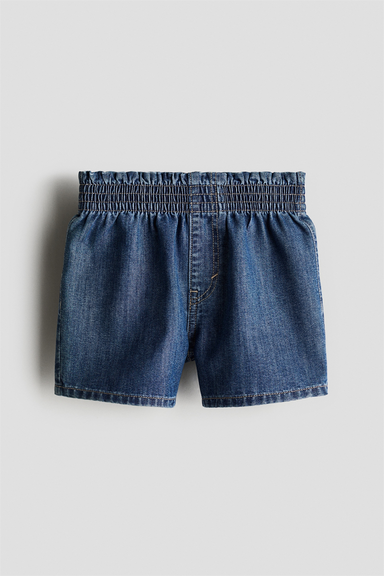 Шорты свободного покроя из моющегося легкого денима. Легкая утяжка на талии, эластичная вставка и фальшивая ширинка.