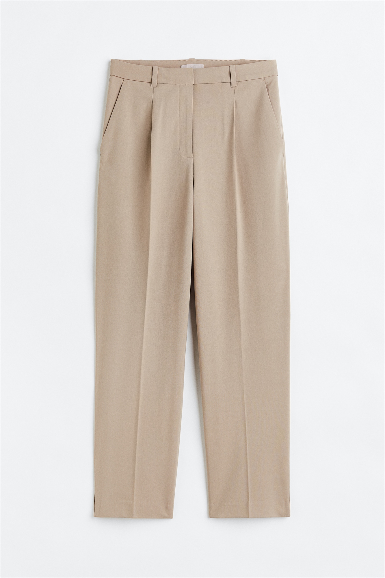 Приталенные брюки длиной до щиколоток из тканого материала. Ширинка на молнии с застежкой на крючок и глазок, диагональные карманы спереди и фальшивые накладные карманы сзади. Прямые ноги со складками в верхней части, складки спереди и сзади и небольшой разрез на подоле.