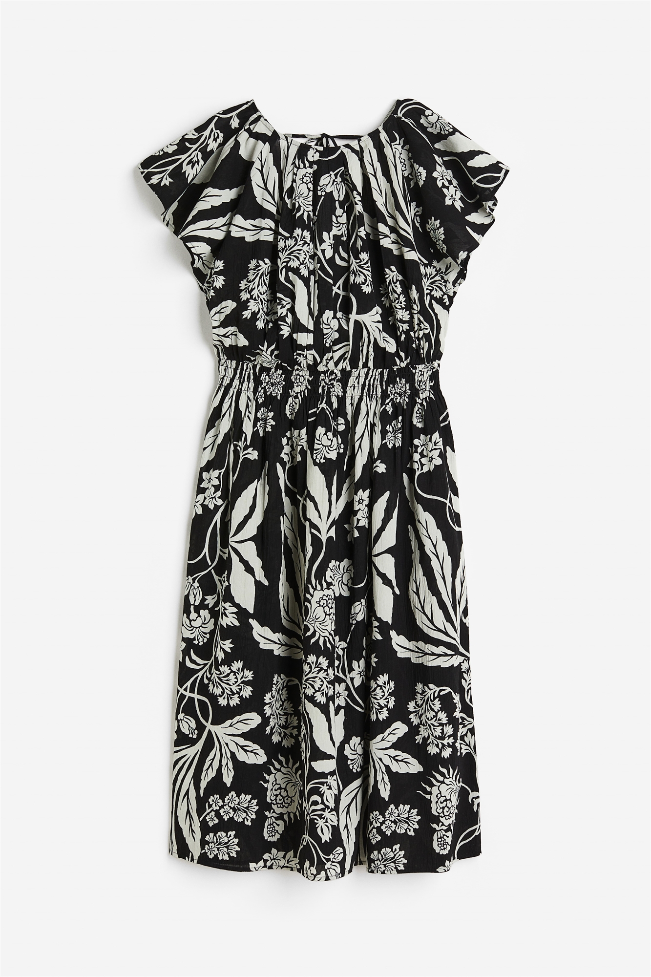Платье длиной до колена из махрового хлопкового полотна с круглым вырезом и эластичной открытой частью сзади с узкими горизонтальными завязками. Короткие рукава-бабочки, завязки на талии и расклешенная юбка. Без подкладки.