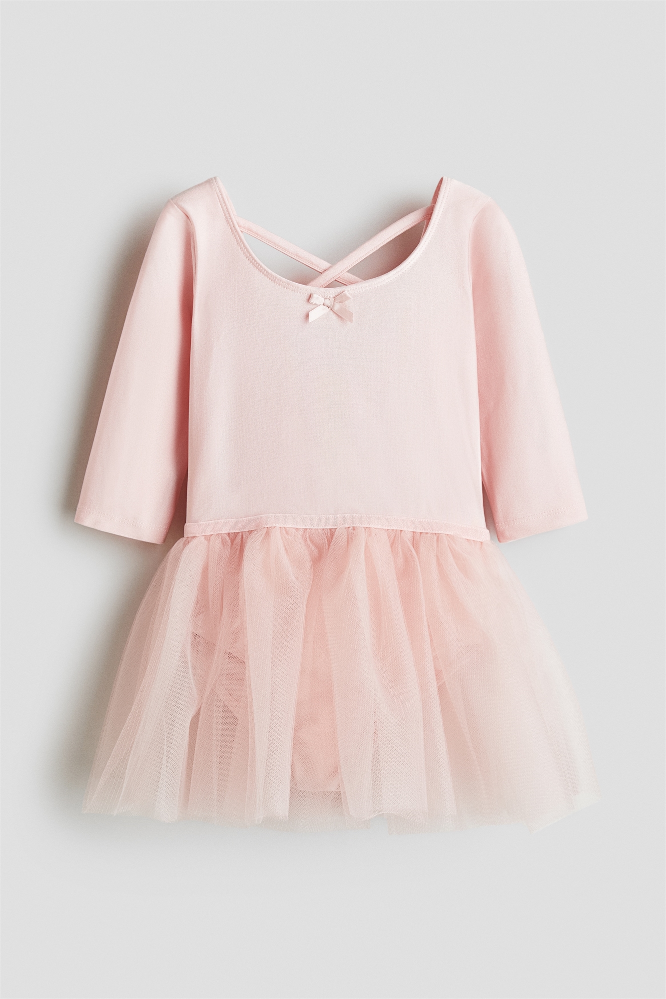 Купальник для танцев из блестящего трикотажа с перекрещивающимися бретелями сзади и рукавами длиной 3/4. Эластичный пояс с блестками и двухслойная юбка из блестящего тюля.