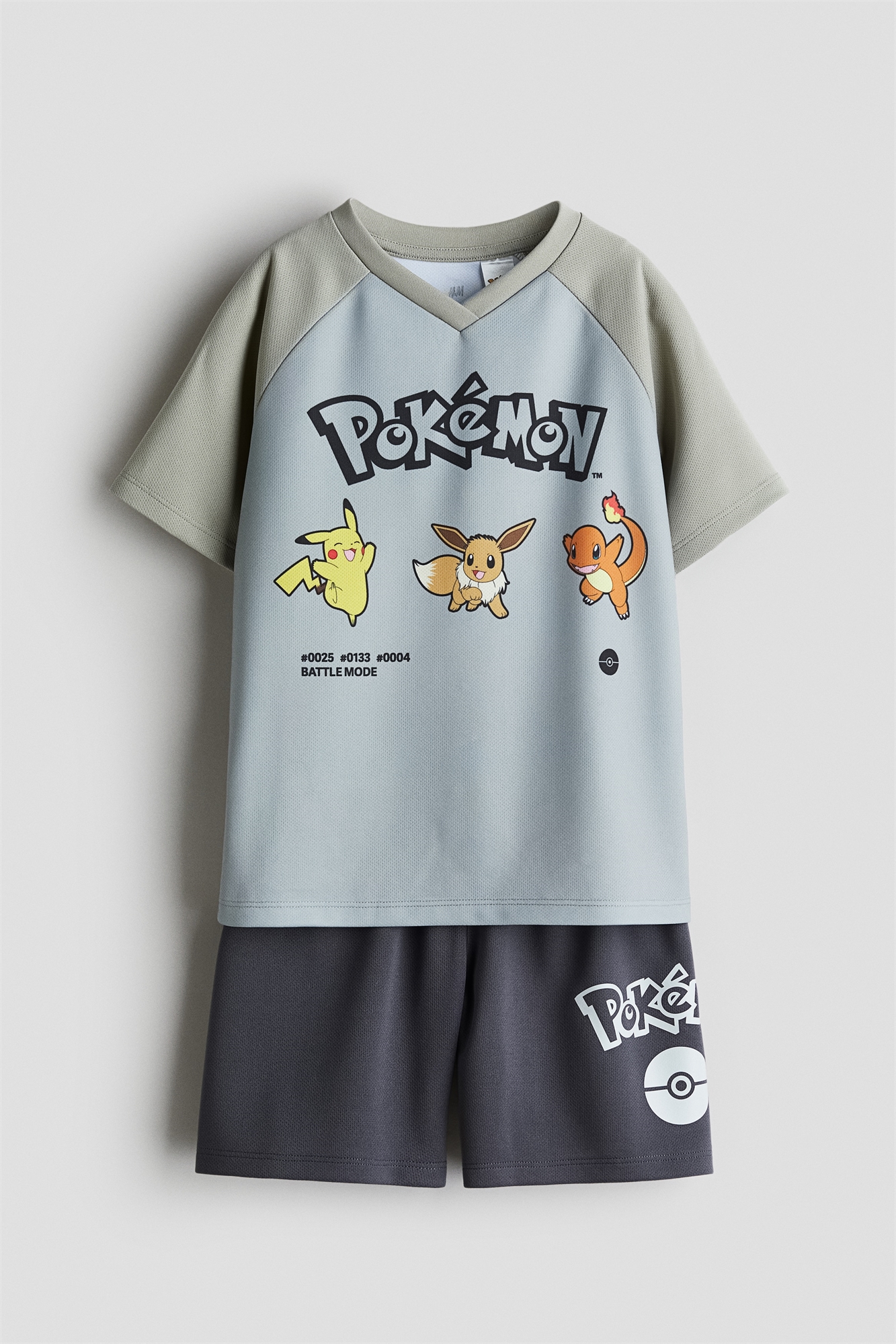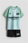 Комплект из футбольного топа и футбольных шорт из быстросохнущей функциональной ткани, которая сохраняет сухость и прохладу. Топ с принтом, круглым вырезом с ребристой отделкой и рукавами реглан. Шорты с эластичным утягивающим поясом и принтом на ногах.