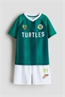 Комплект из футбольного топа и футбольных шорт из быстросохнущей функциональной ткани, которая сохраняет сухость и прохладу. Топ с принтом, круглым вырезом с ребристой отделкой и рукавами реглан. Шорты с эластичным утягивающим поясом и принтом на ногах.