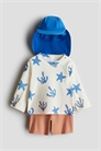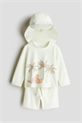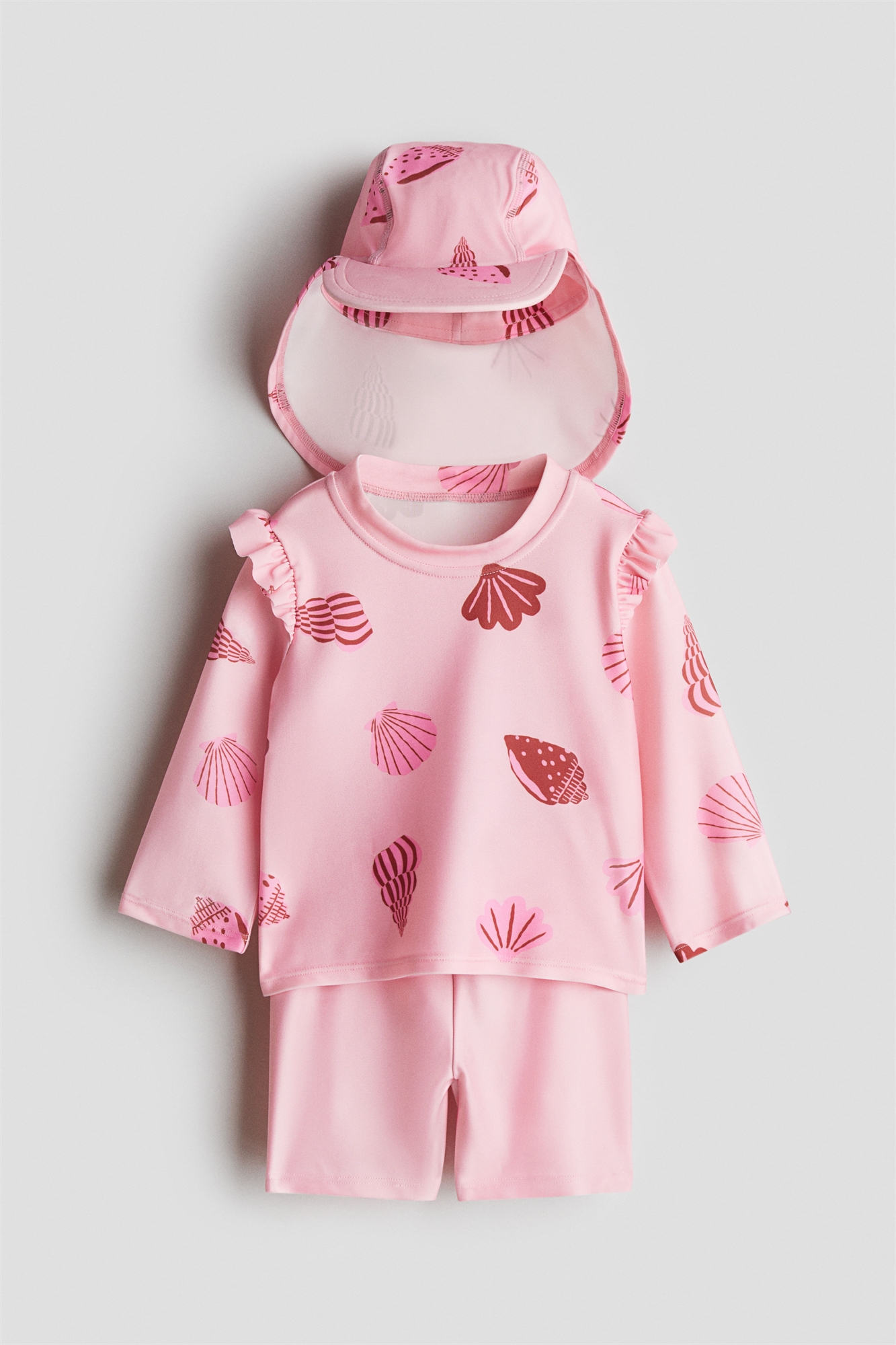 Комплект из купального топа, плавок и шапочки из материала с УФ-защитой. Топ с круглым вырезом и длинными рукавами реглан. Шорты с эластичной утягивающейся талией. Шапочка с козырьком спереди и отворотом сзади для защиты задней части шеи. UPF 50.