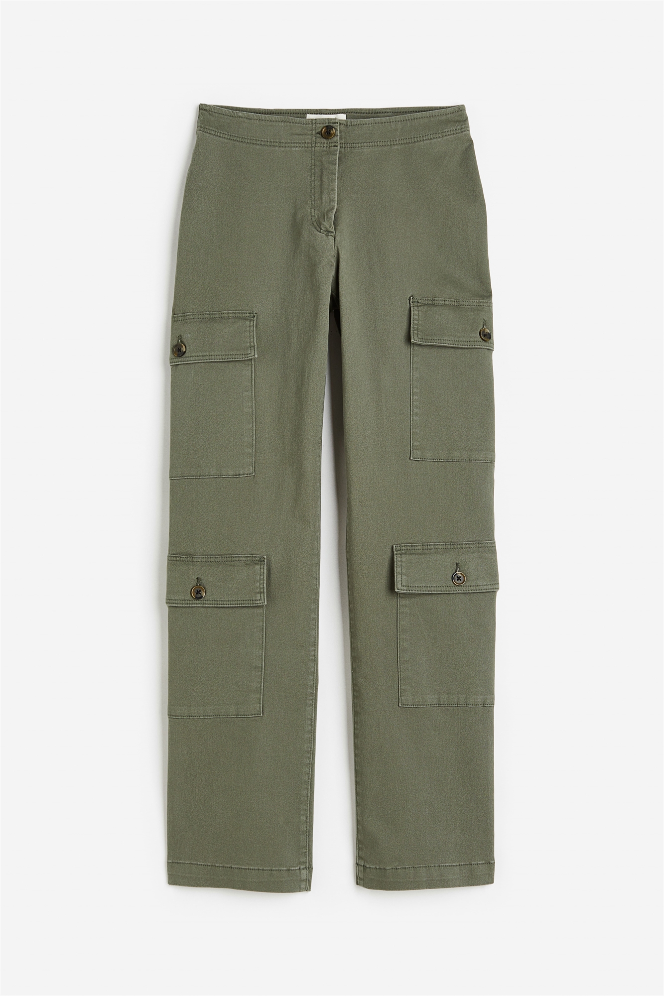 Облегающие брюки-карго из хлопковой саржи. Регулярная талия, ширинка на молнии и пуговице, накладные карманы на ногах с пуговицей и фальшивый накладной карман сзади.