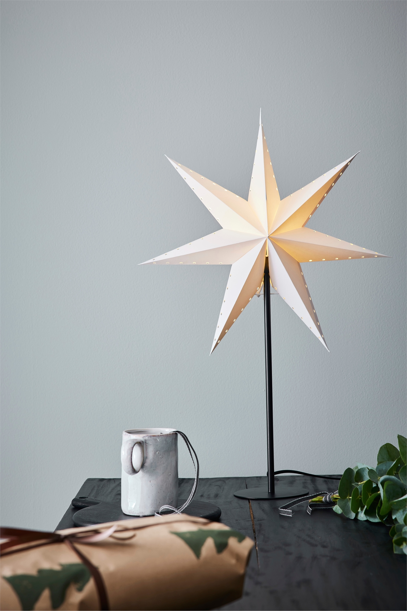 Рождественская звезда с небольшими декоративными отверстиями по внешним краям на черном основании лампы. Для звезды требуется лампочка с маленьким цоколем (E14) мощностью не более 6 Вт на светодиодах, в комплект не входит. Кабель длиной 2 м с выключателем и диммируемой лампочкой. Размер лампы: 45 см в ширину, 16 см в глубину, 65 см в высоту.