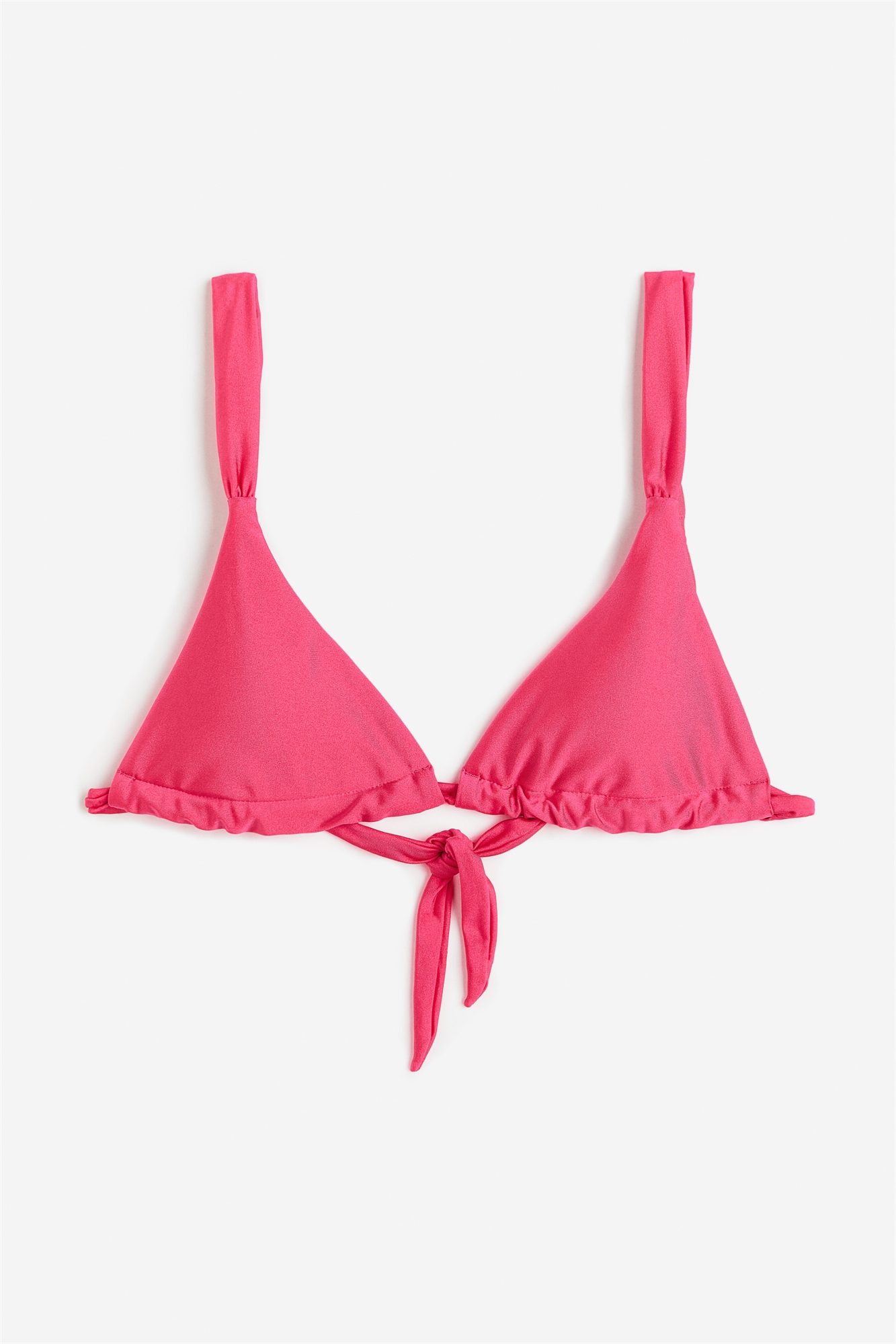 Бикини-треугольник без подкладки, с регулируемыми бретелями и чашечками со съемными вставками, придающими форму бюсту и обеспечивающими хорошую поддержку. Завязки сзади.