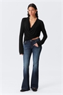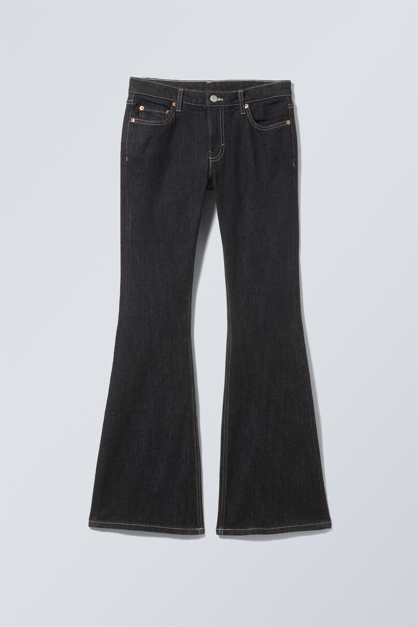 Джинсы с заниженной посадкой, расклешенными штанинами и удлиненной длиной. Джинсы изготовлены из эластичного жесткого денима из органического хлопка с добавлением переработанного хлопка. Они имеют классический дизайн с 5 карманами и застежку-молнию.