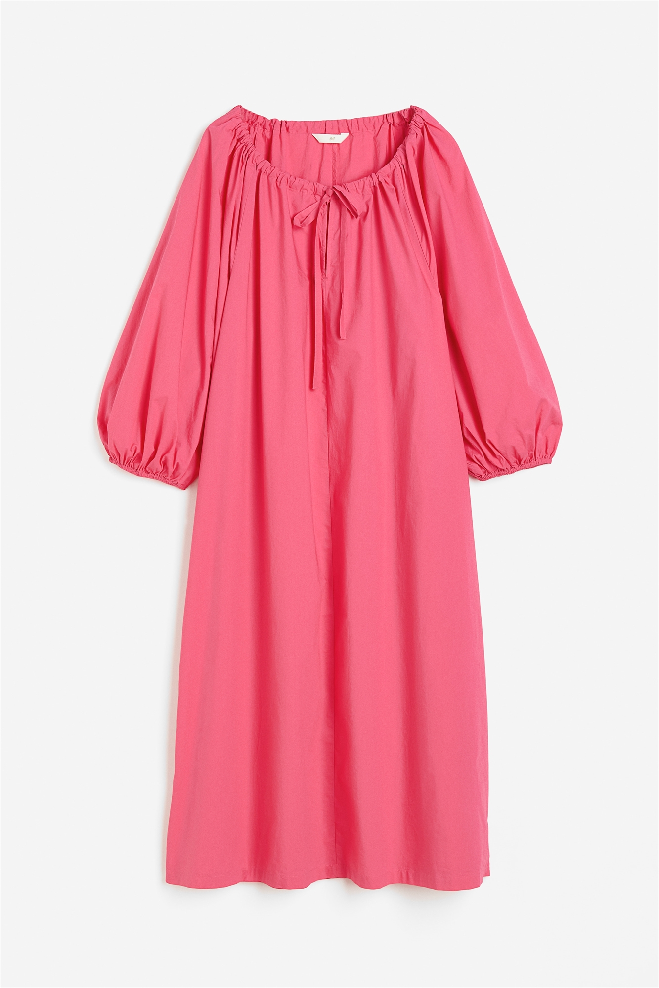 Платье длиной до колен из воздушного хлопкового полотна. Свободный крой с широким вырезом на завязках и V-образной проймой с узкими завязками в верхней части. Объемные рукава-баллоны длиной 3/4 покроя реглан с узкими эластичными манжетами. Без подкладки.