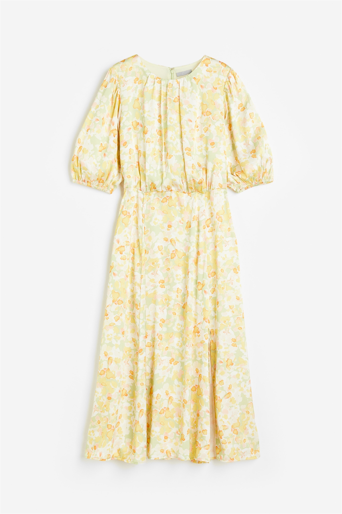 Платье длиной до колен из мягко драпирующегося атласа. Круглый вырез, потайная застежка-молния и застежка-крючок сзади на шее и рукава-баллон длиной до локтя с узкими эластичными манжетами. Сборки на вырезе и талии для эффекта драпировки и мягко расклешенная юбка с высоким разрезом спереди. На подкладке.