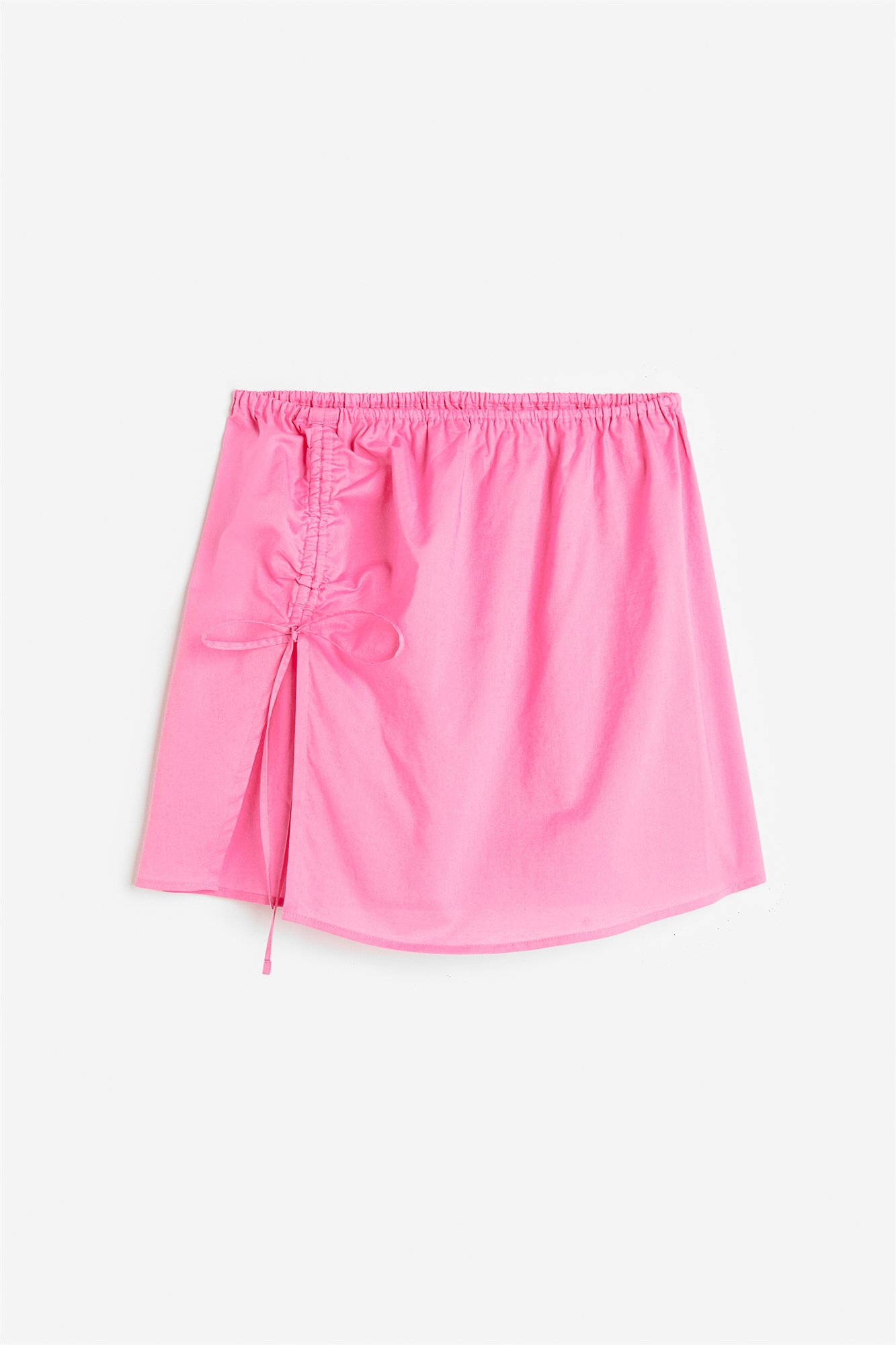 Короткая пляжная юбка из воздушного хлопкового поплина с утягивающим шнурком по одной стороне спереди, создающим эффект рюша, и разрезом на подоле. Высокая талия с узкой, закрытой резинкой.