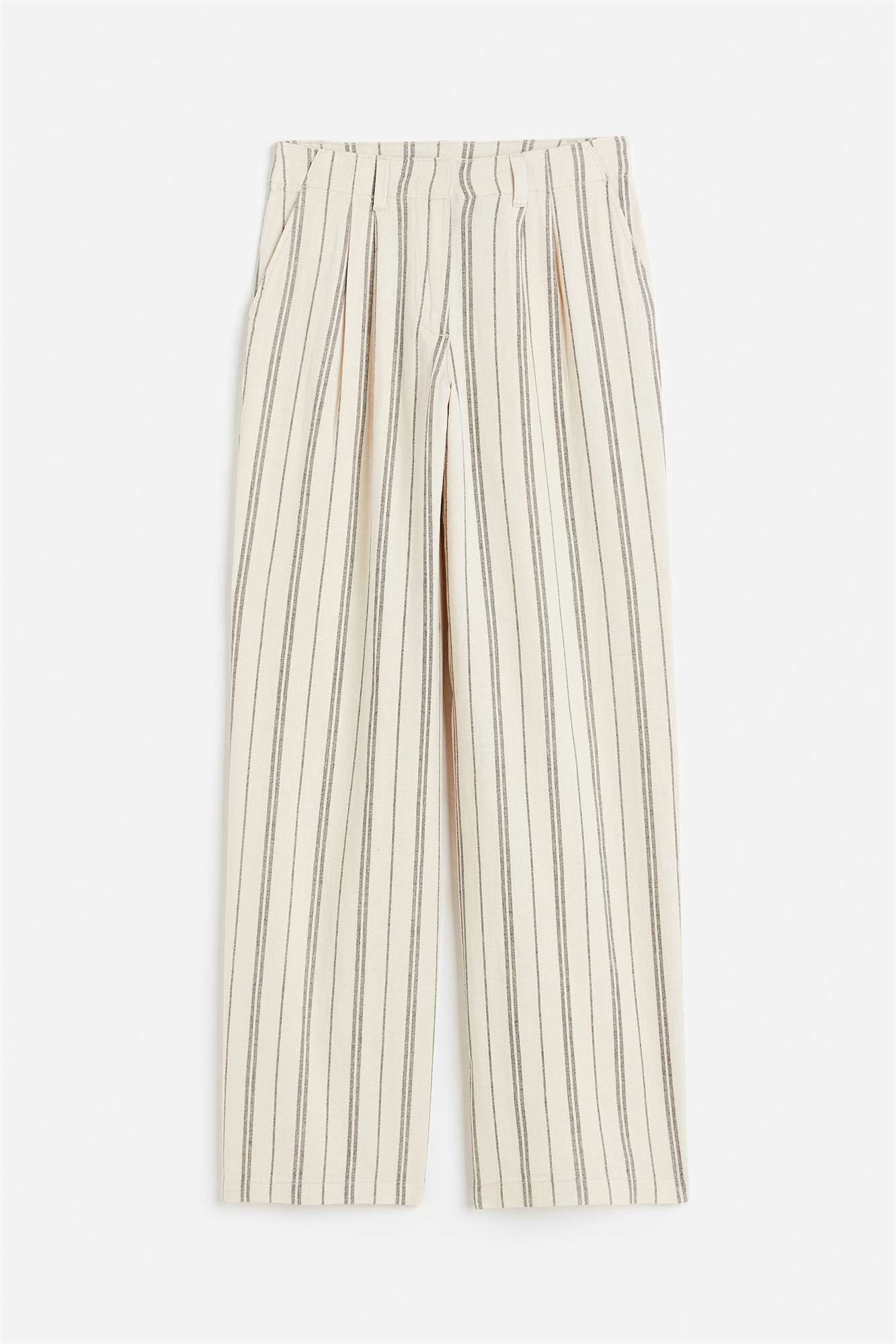 Свободные брюки из вискозы и льна со складками спереди. Регулярная талия, ширинка на молнии и потайная застежка на крючок и глазок. Диагональные боковые карманы, втачной карман сзади и прямые ноги.