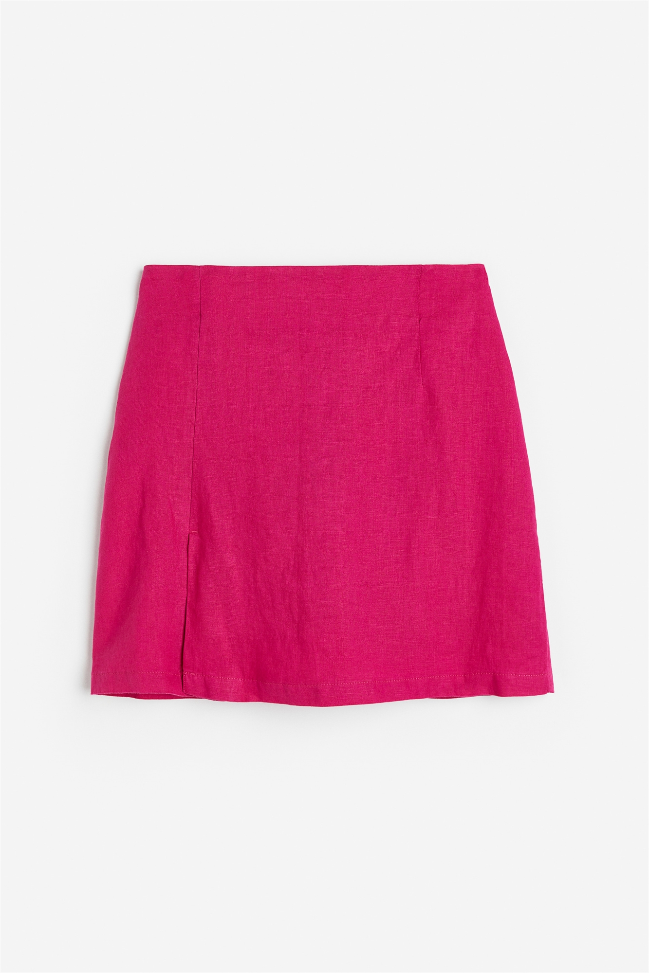 Короткая юбка из льна с разрезом спереди. Высокая талия со скрытой эластичной резинкой и застежкой на молнию с крючком сзади. Подкладка из хлопкового полотна.