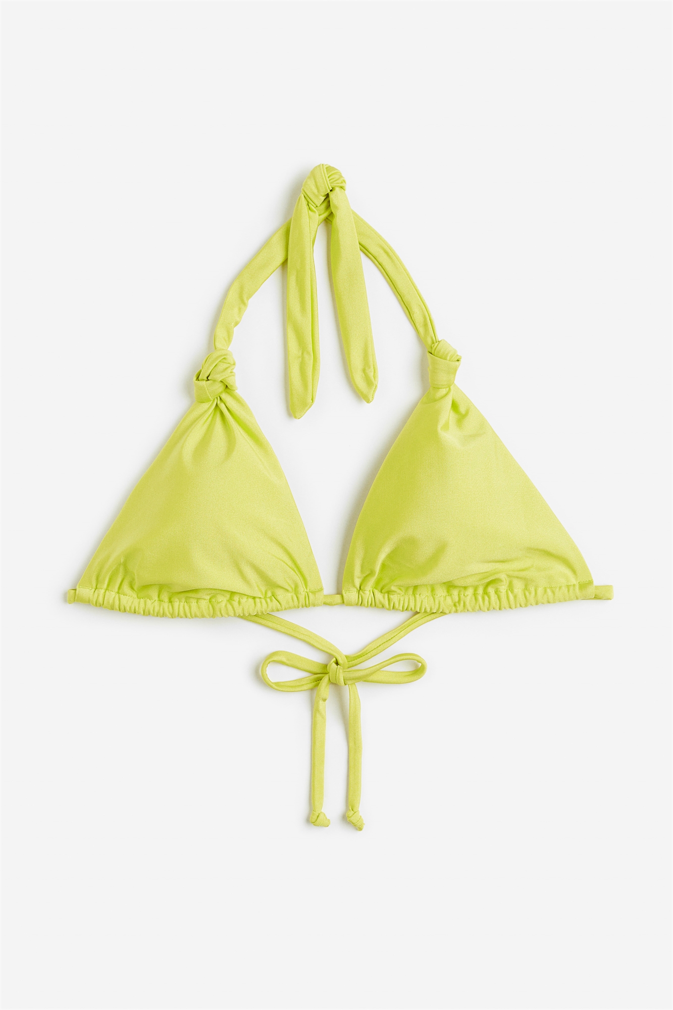 Треугольный бикини на подкладке, без проводов, с завязанными на узел бретелями и завязками сзади. Чашечки со съемными вставками, придающими форму бюсту и обеспечивающими хорошую поддержку.