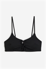 Бикини на подкладке, без проводов, с регулируемыми бретелями и чашечками со съемными вставками, придающими форму бюсту и обеспечивающими хорошую поддержку. Деталь со шнуровкой спереди. Без застежек.