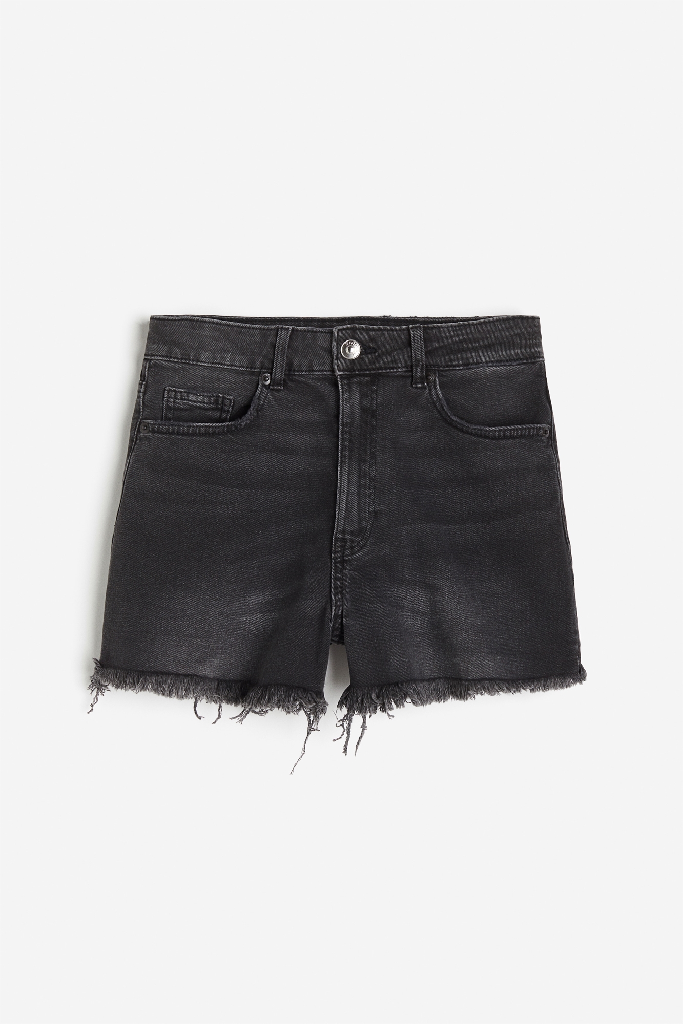 Облегающие шорты с 5 карманами из слегка эластичного хлопкового денима с высокой талией, ширинкой на молнии и пуговице и необработанными краями.