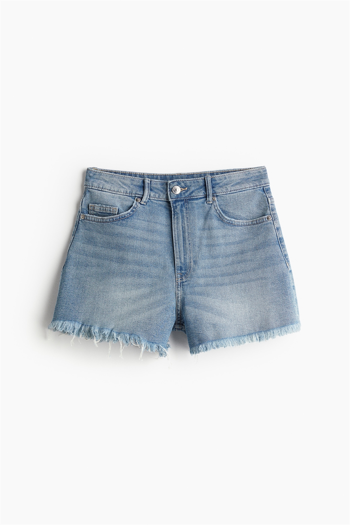 Облегающие шорты с 5 карманами из слегка эластичного хлопкового денима с высокой талией, ширинкой на молнии и пуговице и необработанными краями.