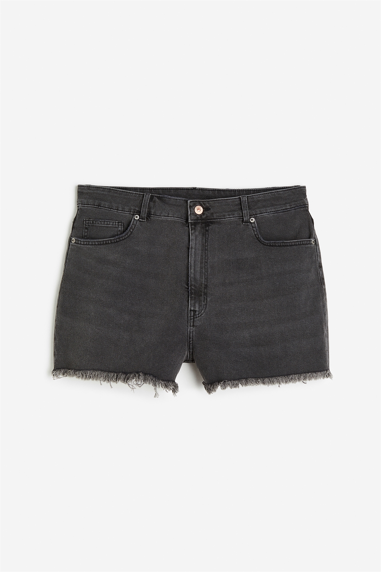 Облегающие шорты с 5 карманами из слегка эластичного хлопкового денима с высокой талией, застежкой на молнию и пуговицу и необработанными краями.