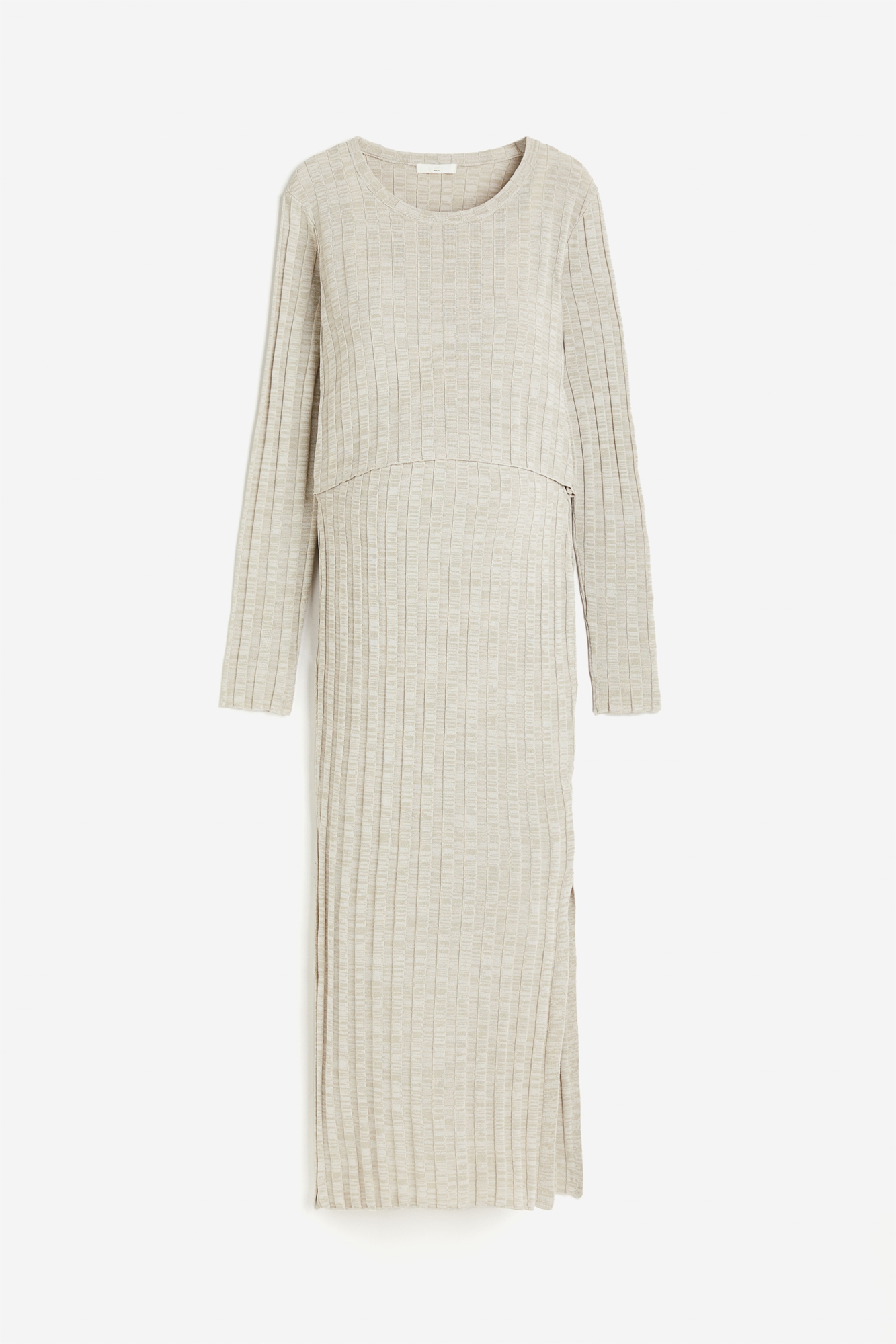 Комплект из топа и юбки из тонкого трикотажа в рубчик. Короткий топ с круглым вырезом и длинными рукавами. Юбка длиной до щиколотки с высокой талией, скрытой резинкой в верхней части и разрезом с одной стороны подола.
