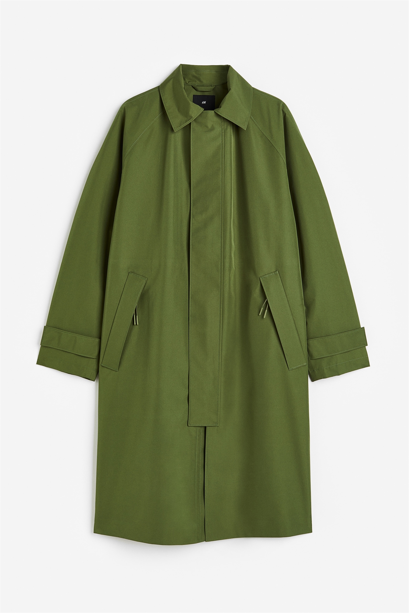 Плащ свободного кроя из ветрозащитной, водонепроницаемой и дышащей ткани рипстоп. Воротник, застежка-молния спереди и штормовой клапан с потайными кнопками. Косые передние карманы на потайной молнии. Длинные рукава с вышитыми люверсами в подмышках для дополнительной вентиляции и регулируемой застежкой с прижимной планкой на манжетах. Прорезь для ходьбы сзади и слегка закругленный подол. Подкладка с проклеенными швами.