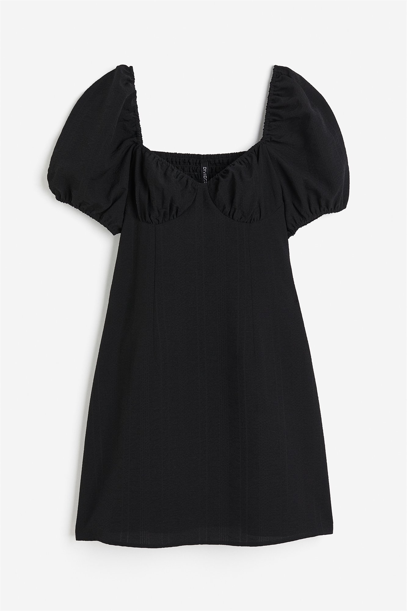 Короткое крепдешиновое платье с вырезом в форме сердца, короткими пышными рукавами и узкими эластичными лентами по вырезу, плечам и рукавам спереди. Предварительно сформированные чашечки, потайная застежка-молния сбоку и платочная вставка сзади. Слегка расклешенная юбка.
