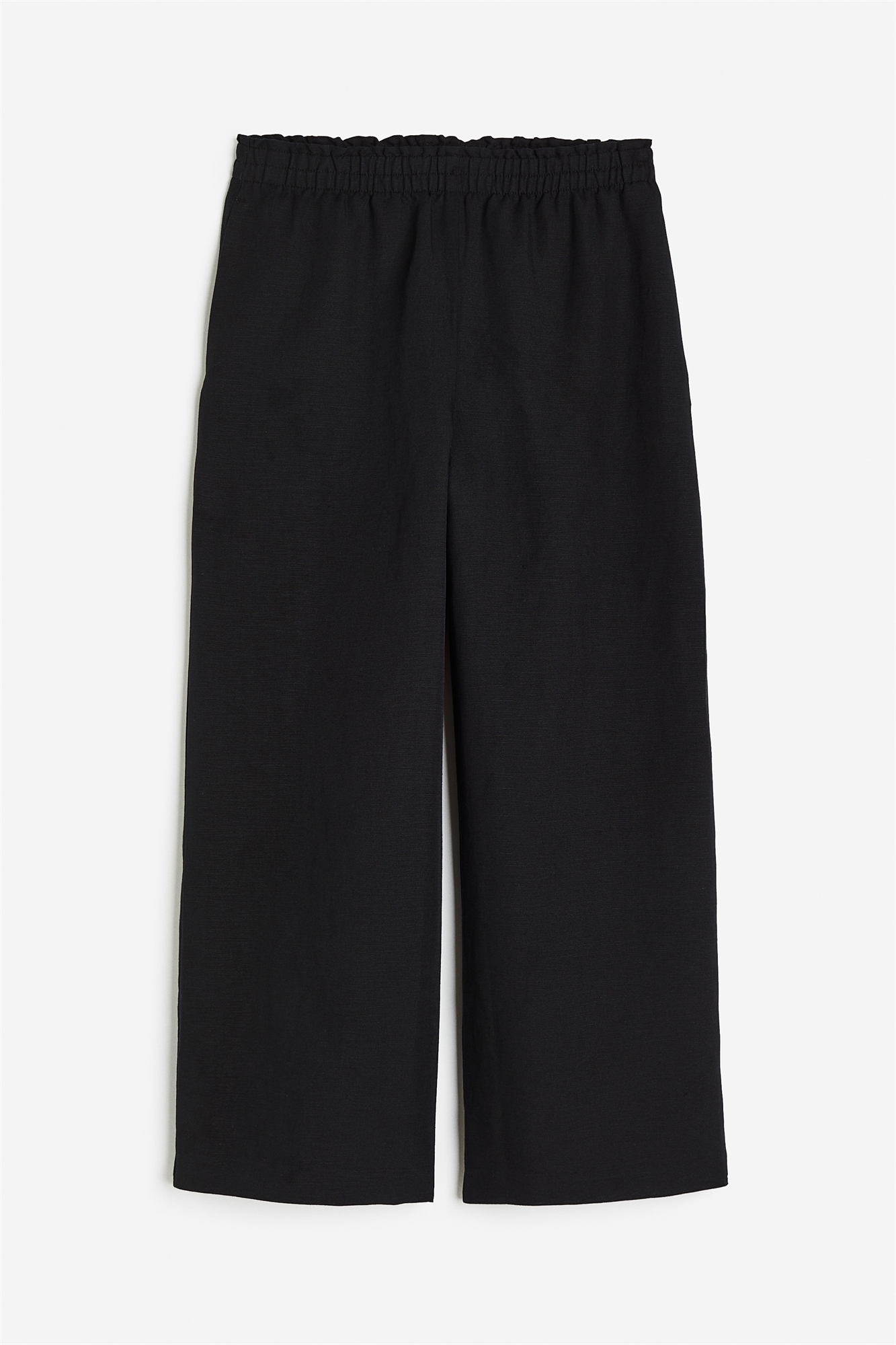 Укороченные брюки из льна и вискозы. Свободный крой с высокой эластичной талией, незаметными карманами в боковых швах и широкими прямыми ногами.
