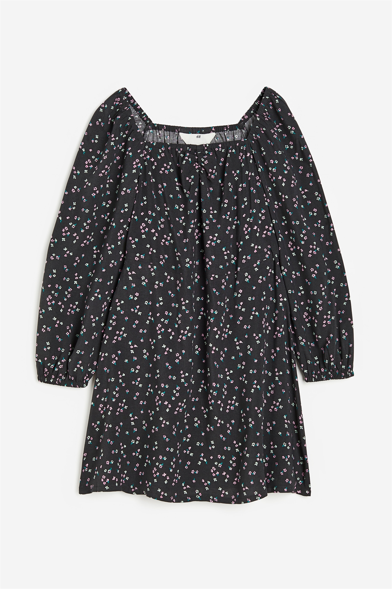 Платье а-линия из воздушного сиреневого полотна с квадратным вырезом и рюшами в верхней части. Длинные рукава-баллоны и эластичная отделка по вырезу и манжетам. Видимый шов на талии и расклешенная юбка. Без подкладки.