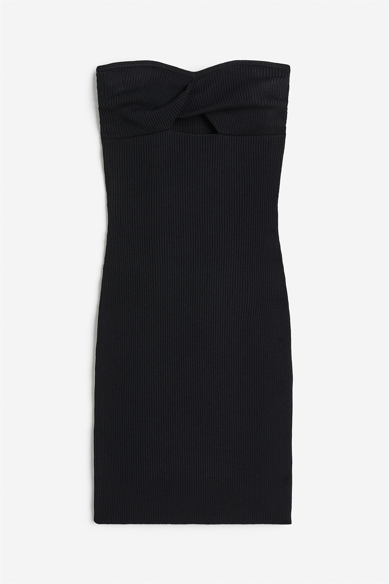 Короткое приталенное платье-бандо из мягкого трикотажа в рубчик, с вырезом в форме сердца, формованными чашечками, витыми деталями и вырезом по центру бюста. Прямой подол.