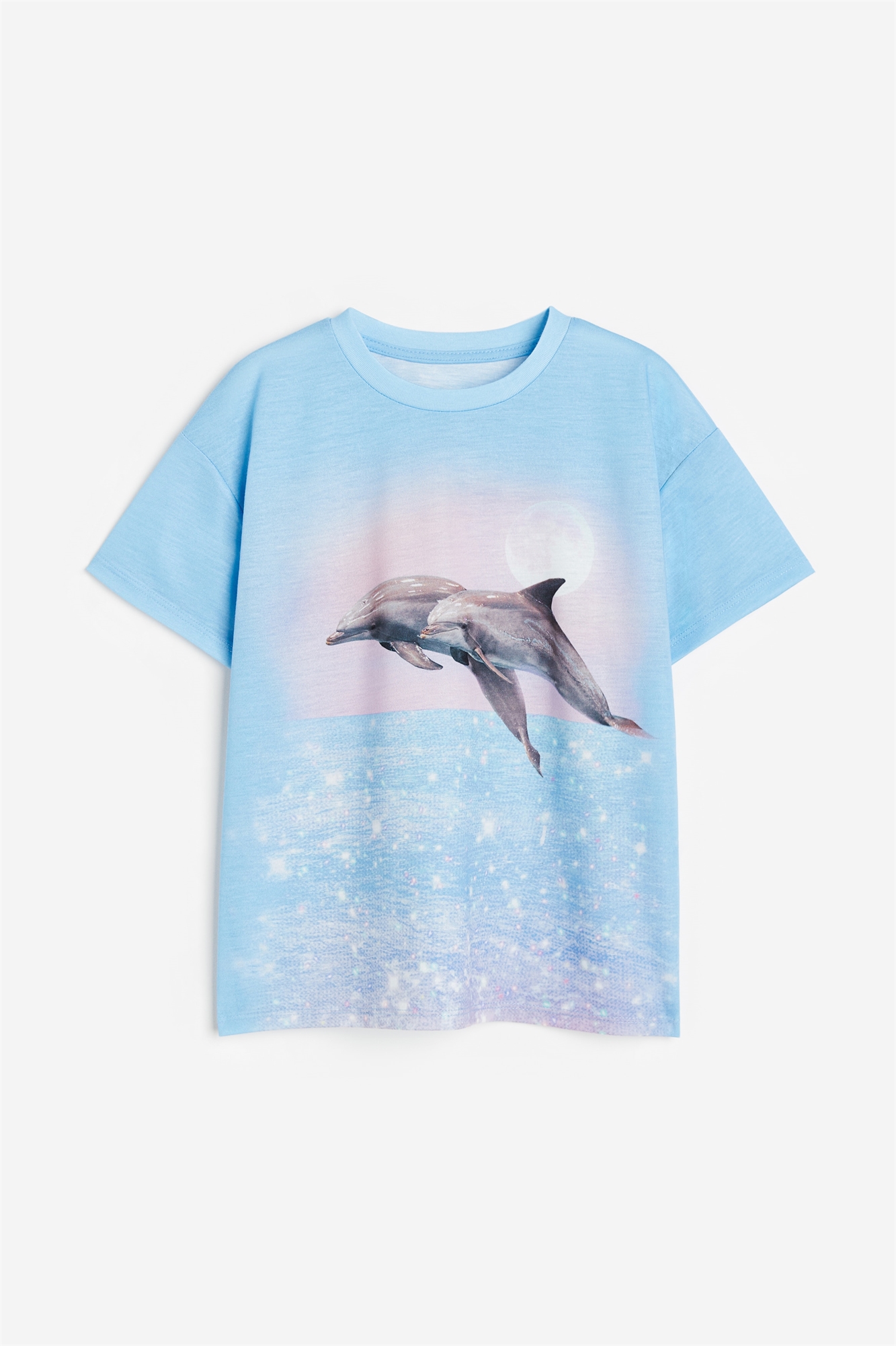 Футболка оверсайз из принтованного трикотажа. С круглым ребристым вырезом и спущенными плечами.