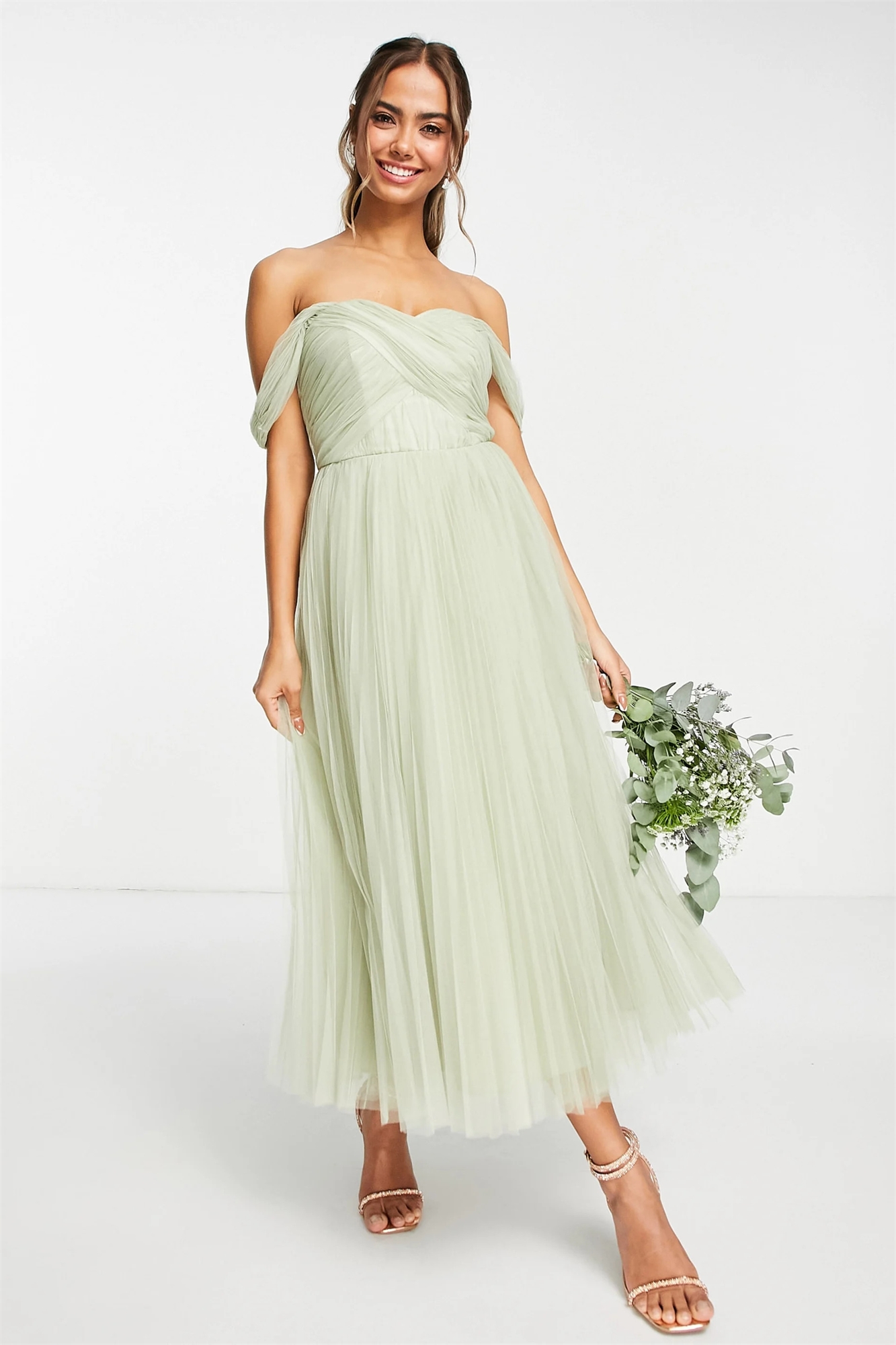 Платье средней длины из тюля для подружки невесты с открытыми плечами, завязками на спине и плиссированной юбкой