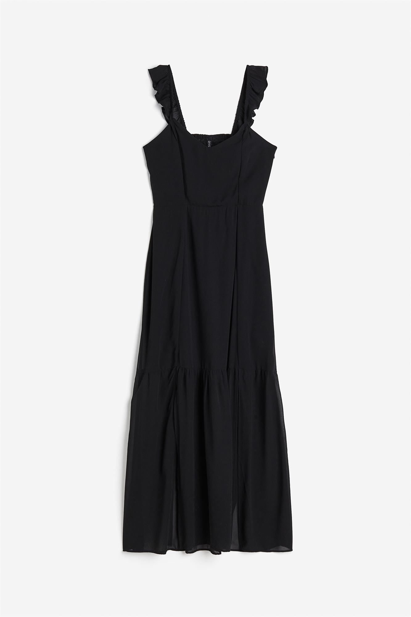 Длинное платье из воздушного шифона. V-образный вырез спереди, бретели с оборками, приталенный лиф и частично открытая спина с широкой, скроенной по верху панелью. Шов на талии с узкой эластичной резинкой сзади. Потайная застежка-молния с одной стороны и расклешенная юбка со сборкой ниже бедер для придания объема и ширины. Подол прямого кроя с высокими разрезами спереди. Частично на подкладке.