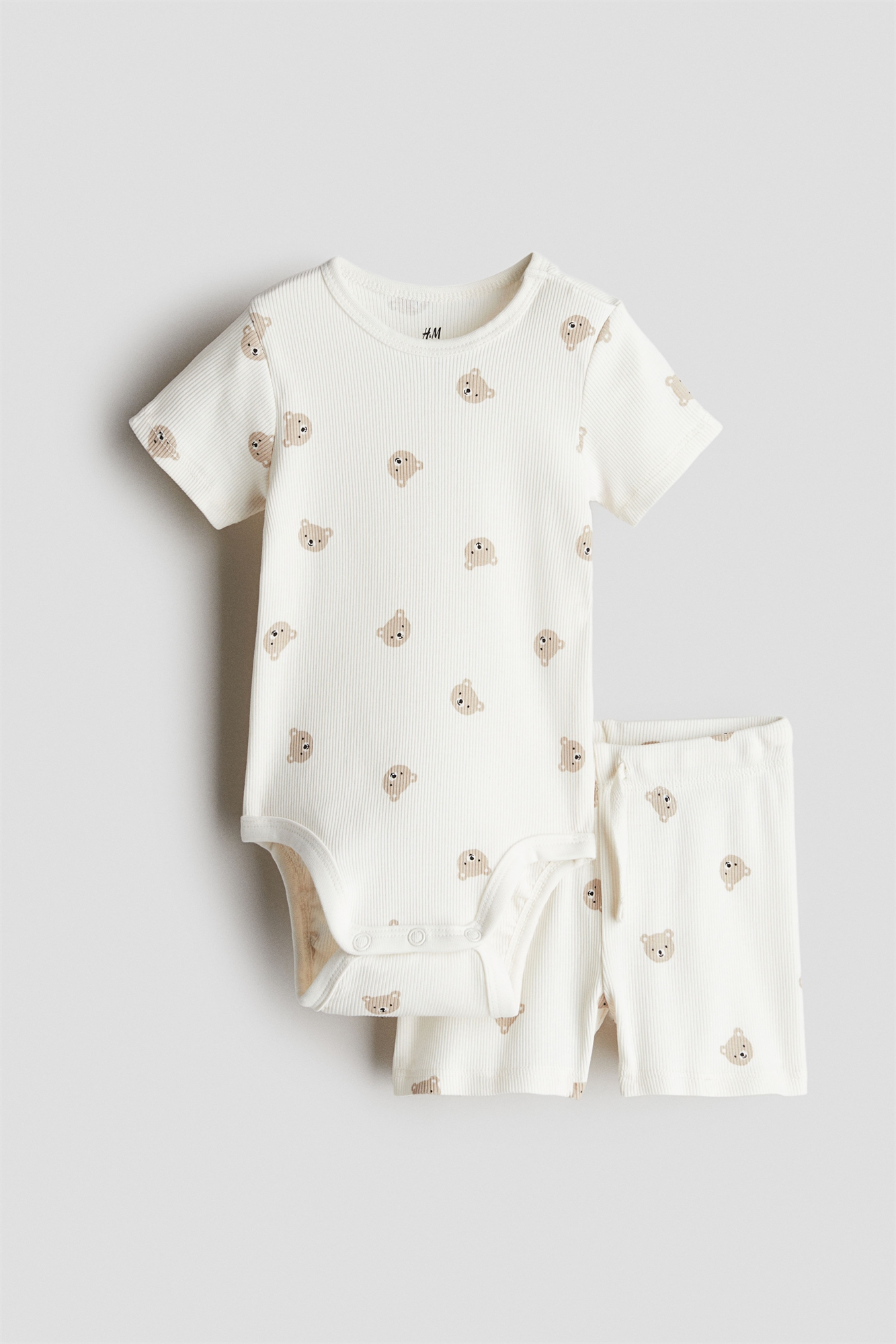 Комплект из комбинезона с короткими рукавами и шорт из мягкого ребристого хлопкового джерси. Боди с потайной кнопкой на одном плече и кнопками в промежности для удобства переодевания. Шорты с эластичной резинкой на талии.