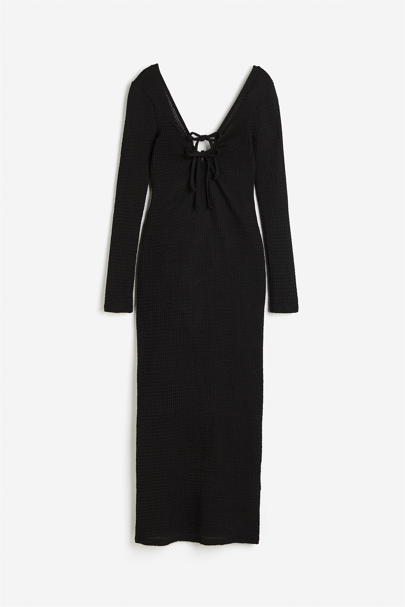 Приталенное платье длиной до колен из фактурного трикотажа с глубоким V-образным вырезом и двумя парами узких завязок спереди. Низкий вырез сзади, длинные рукава и прямой подол.