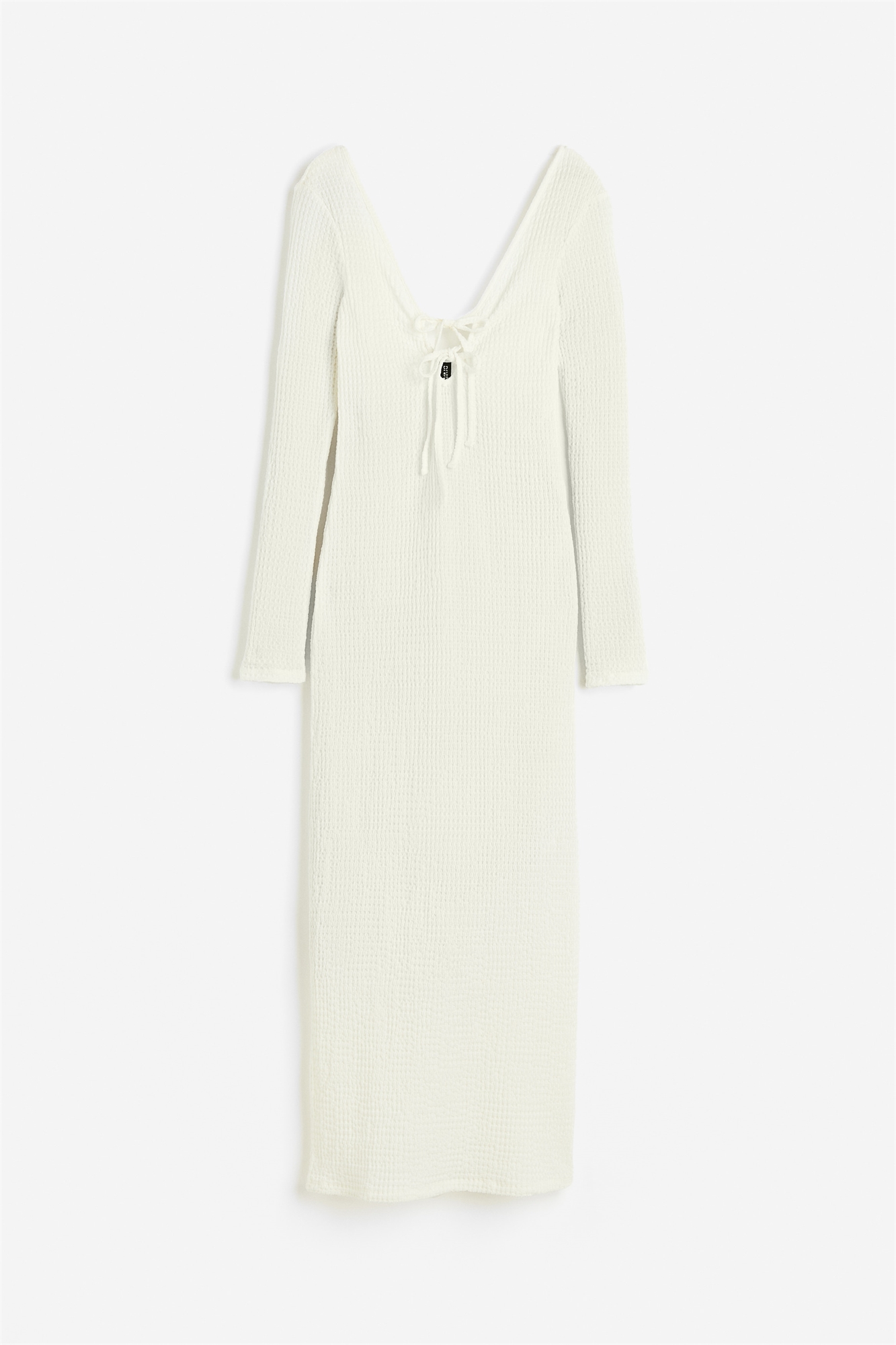 Приталенное платье длиной до колен из фактурного трикотажа с глубоким V-образным вырезом и двумя парами узких завязок спереди. Низкий вырез сзади, длинные рукава и прямой подол.