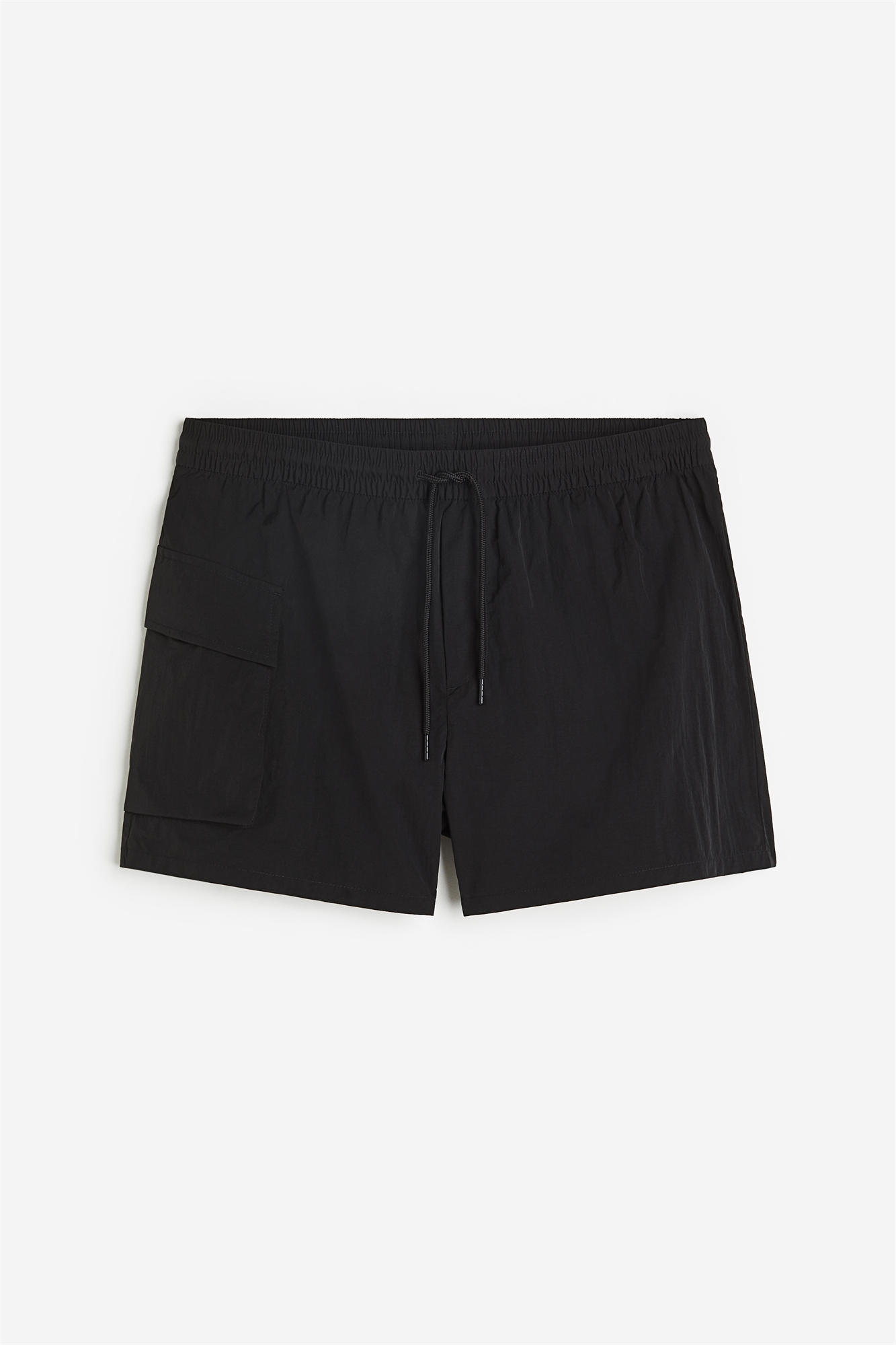 Шорты для плавания из тканого материала с эластичной, утягивающей талией и карманом на ноге с клапаном и внешним карманом на молнии. Внутренние шорты из сетки.