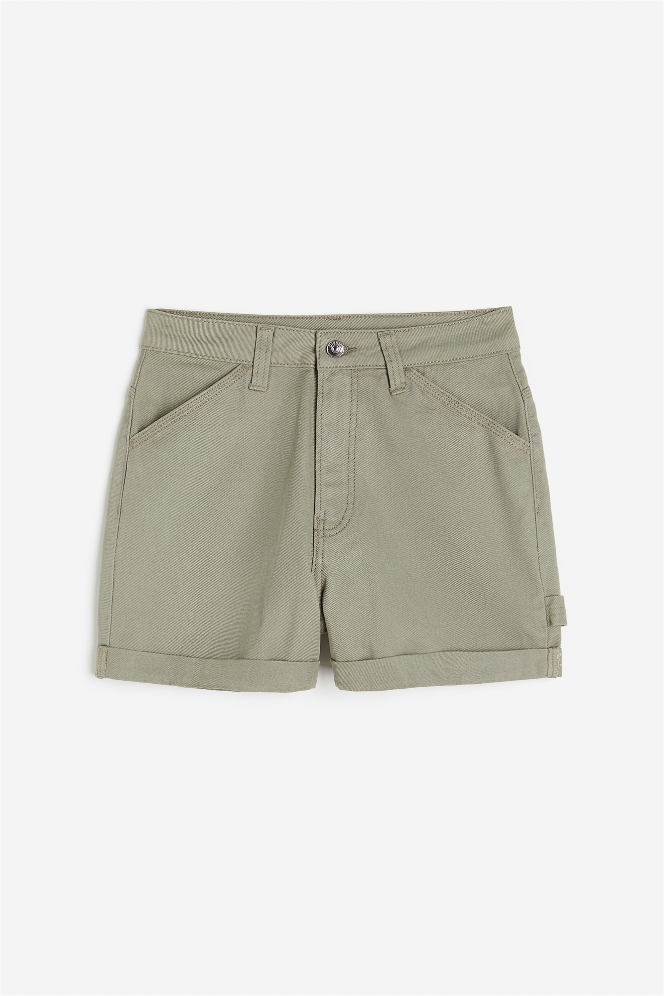 Шорты-карго из прочной хлопковой саржи с высокой талией, ширинкой на молнии и пуговице, диагональными передними и задними карманами. Петля для инструментов сзади и вшитые подвороты на подоле.