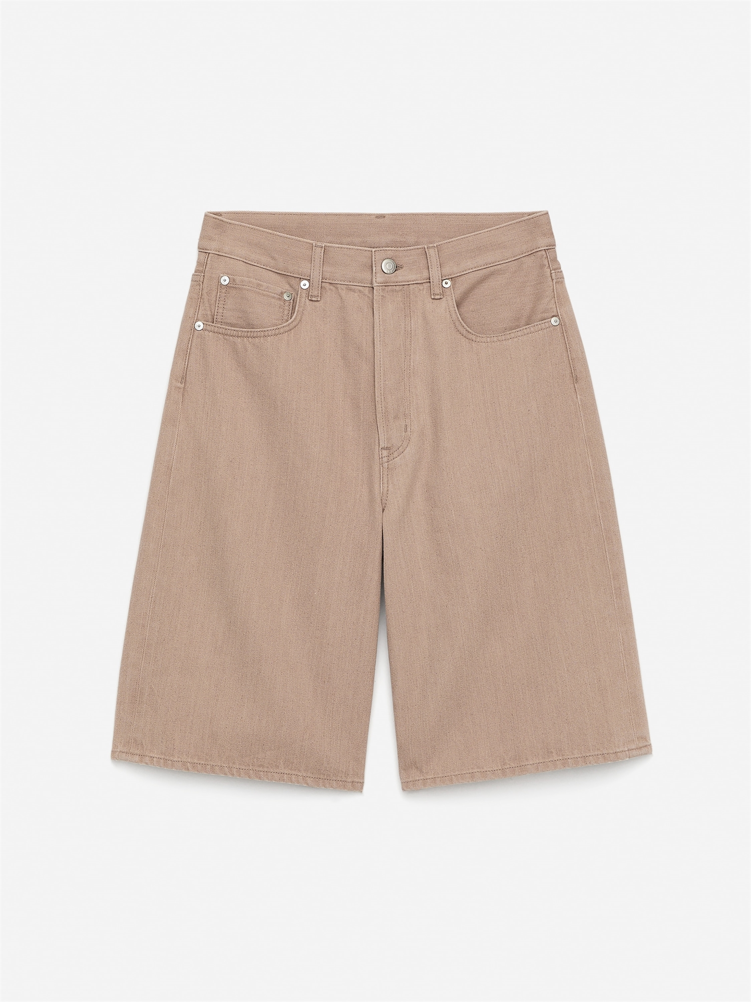 Джинсовые шорты с высокой талией и свободным кроем. Классический 5-карманный фасон с ширинкой на пуговицах. Изготовлены из смеси хлопка и лиоцелла. Внутренняя длина штанины 30 см (размер 28).